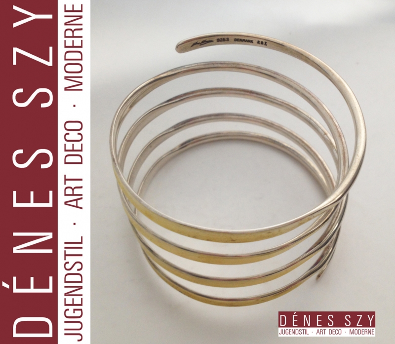 Braccialetto 297 in argento sterling di Hans Hansen degli anni ’50 Braccialetto # 297 Gioielli in argento Design danese, gioielli di design danese, fatto a mano, moderno della metà del secolo, Modello n. 297, argento sterling, parzialmente placcato in oro Design: Karl Gustav Hansen intorno al 1950 Esecuzione: Hans Hansen Silversmiths, Kolding, Danimarca, Dimensioni: diametro circa 6,6 cm, larghezza circa 4,7 cm. – 1 pollice (inch) = 2,54 centimetri – Condizioni: molto buone, minimi segni d’uso