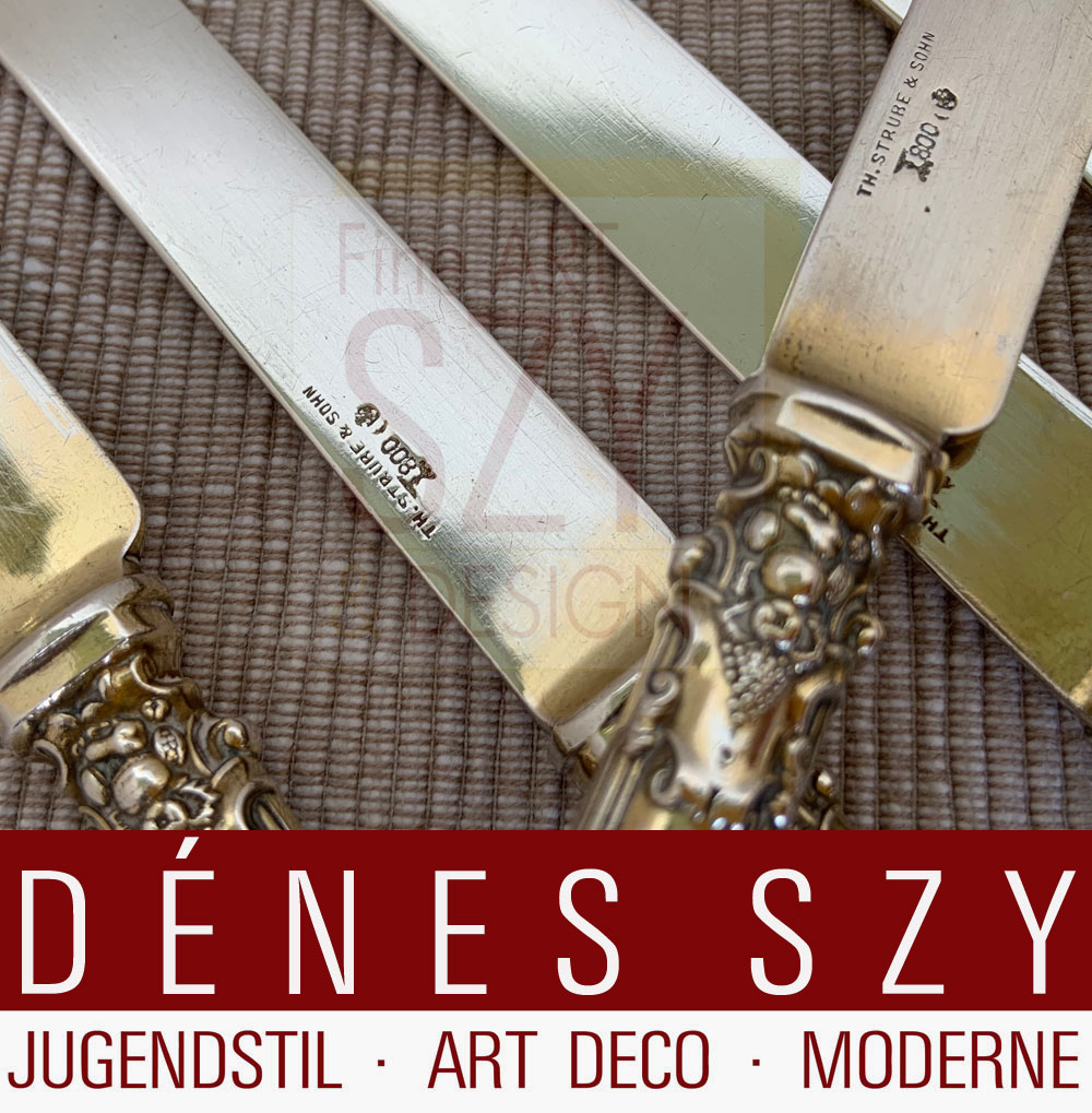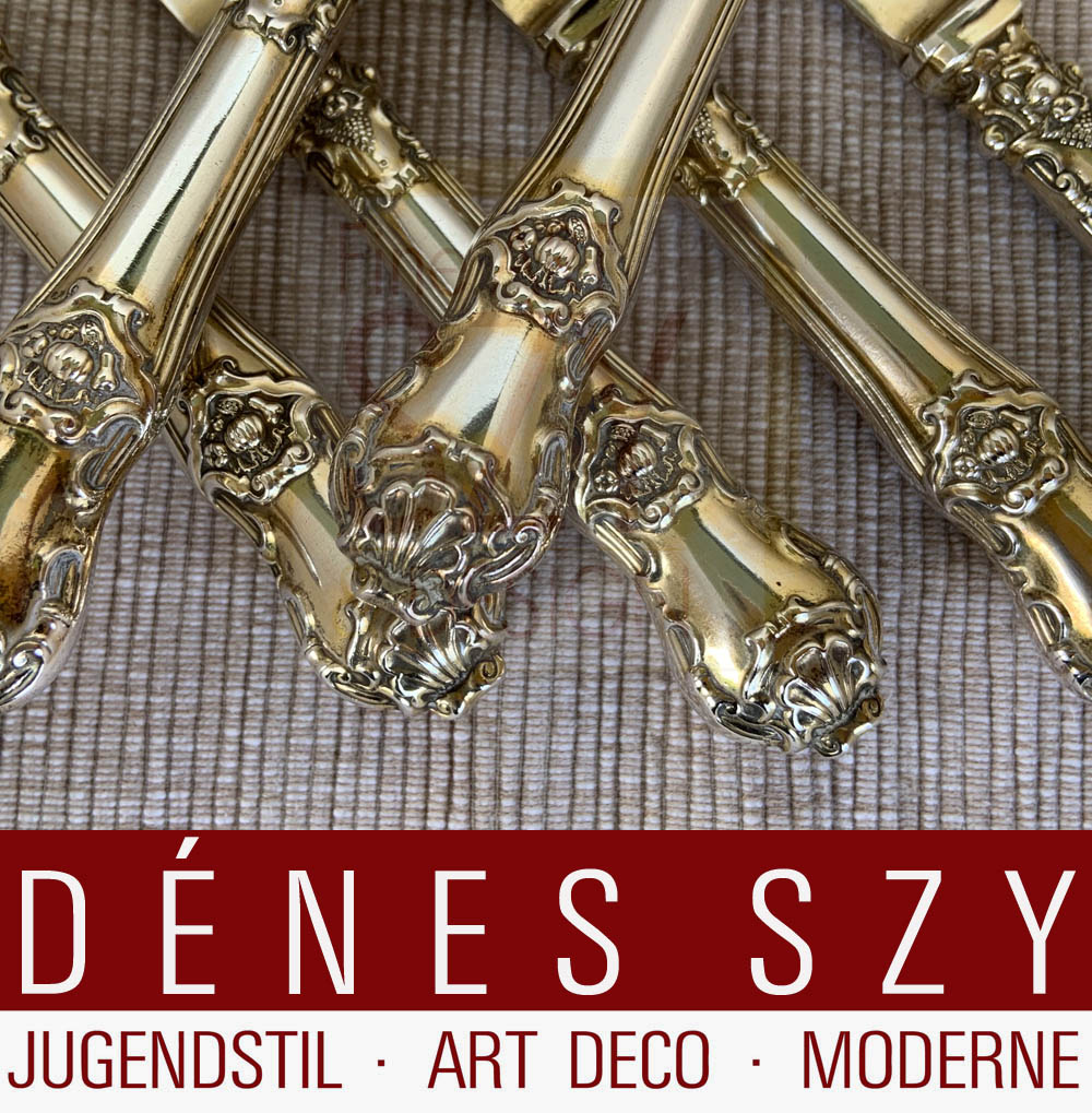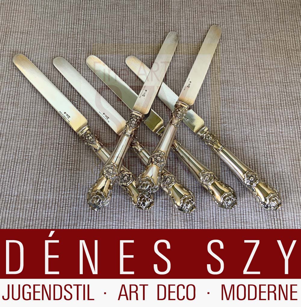Set de 6 couteaux à dessert en argent massif à décor coquillage, Couverts allemands Art Nouveau, Exécution : Silbermanufaktur Koch und Bergfeld, Brême Allemagne, argent 800