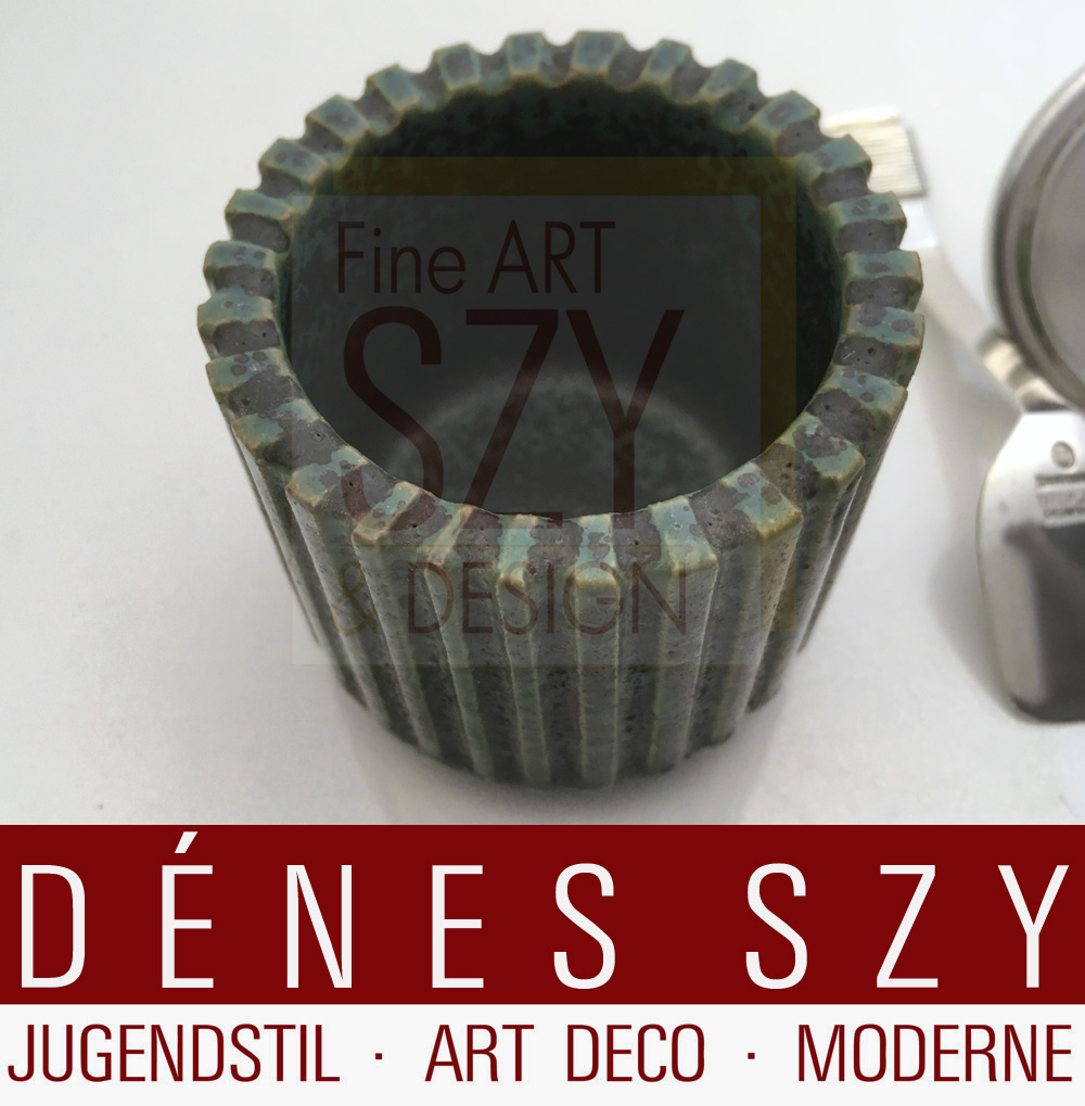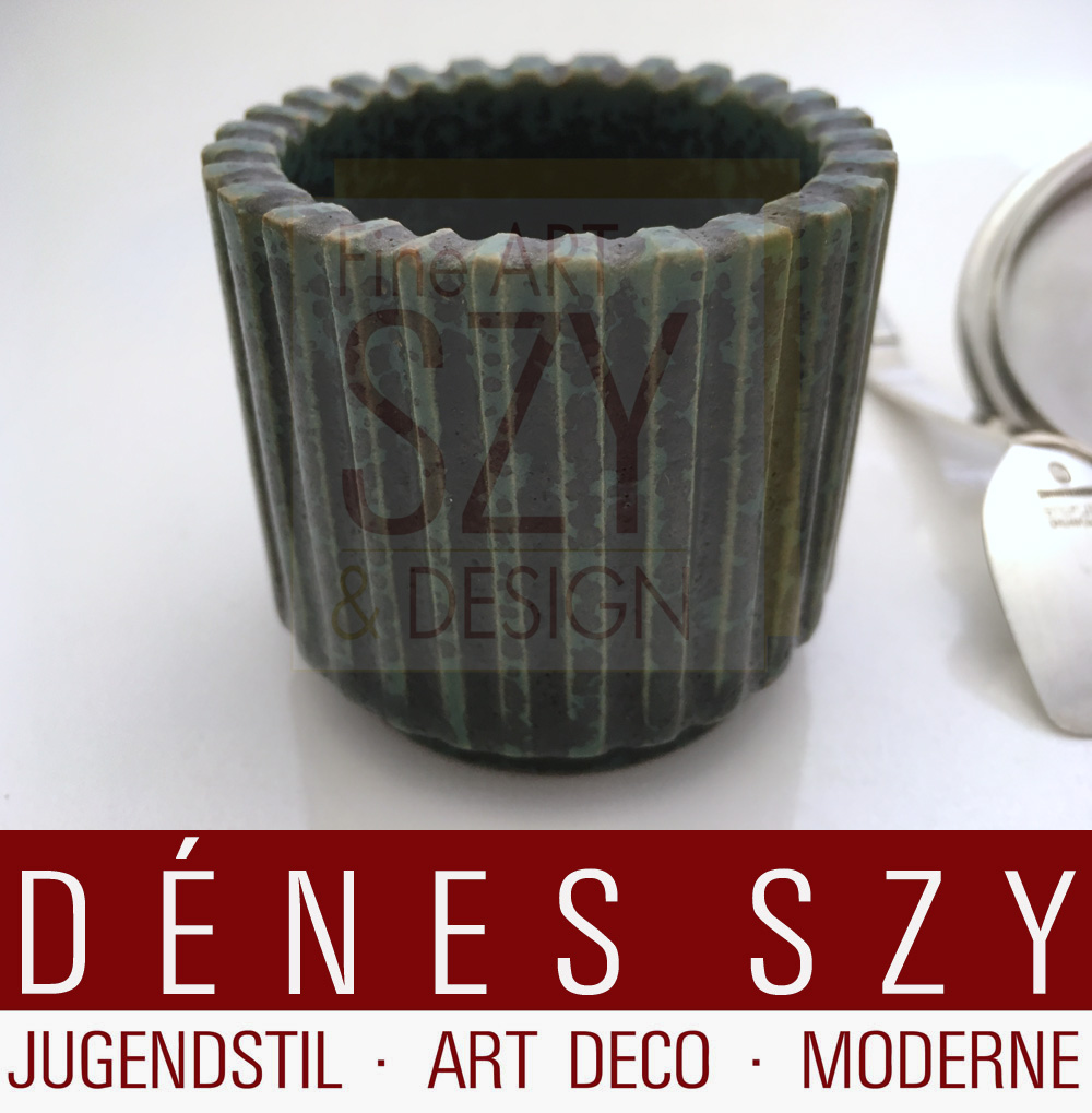 Korpus aus grünlich glasiertem Steinzeug in geriffelter, zylindrischer Form von Arne Bang (Frederiksberg 1901 – 1983 Fensmark), dänischer Designer und Keramiker,