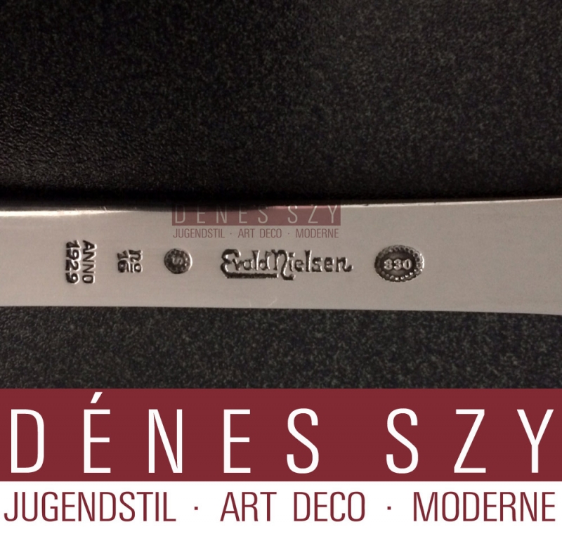 Evald Nielsen [Falster 1879 – 1958 Kopenhagen], dänischer Silberschmied. Aus armen Verhältnissen stammend, ging Nielsen 1893 in die Lehre als Maschinenbediener, danach als Stahlgraveur. 1900 bereiste er Deutschland, die Schweiz und Frankreich, um dort zu arbeiten. Ebenfalls besuchte er die Weltausstellung in Paris. 1905 eröffnete er seine eigene Werkstatt in Kopenhagen und arbeitete dort sowohl als Silberschmied als auch als Graveur, um sein Einkommen zu sichern. Mehr und mehr konzentrierte er sich erfolgreich auf Silber Korpusarbeiten, Schmuck und Bestecke, 1914 arbeiteten bereits 14 Angestellte für ihn. (Nielsen, Evald)