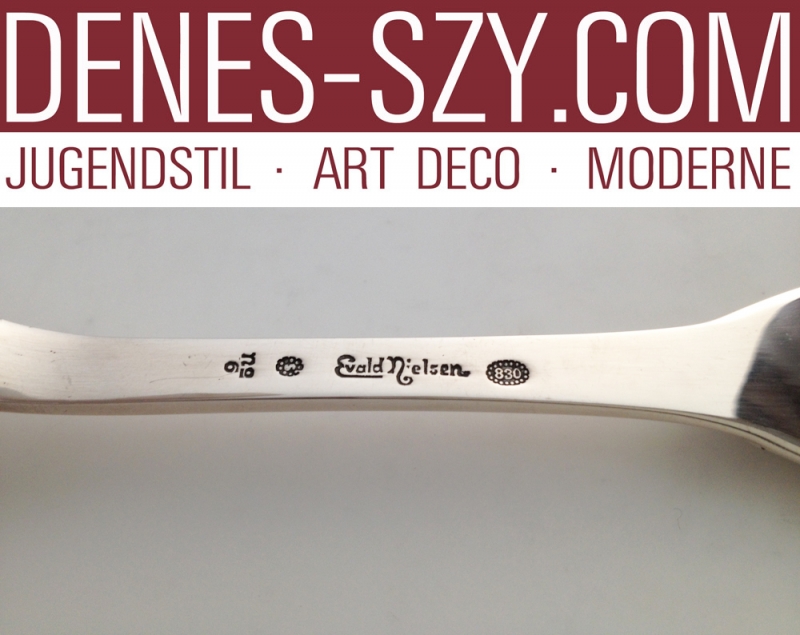 Evald Nielsen [Falster 1879 – 1958 Kopenhagen], dänischer Silberschmied. Aus armen Verhältnissen stammend, ging Nielsen 1893 in die Lehre als Maschinenbediener, danach als Stahlgraveur. 1900 bereiste er Deutschland, die Schweiz und Frankreich, um dort zu arbeiten. Ebenfalls besuchte er die Weltausstellung in Paris. 1905 eröffnete er seine eigene Werkstatt in Kopenhagen und arbeitete dort sowohl als Silberschmied als auch als Graveur, um sein Einkommen zu sichern. Mehr und mehr konzentrierte er sich erfolgreich auf Silber Korpusarbeiten, Schmuck und Bestecke, 1914 arbeiteten bereits 14 Angestellte für ihn. (Nielsen, Evald)
