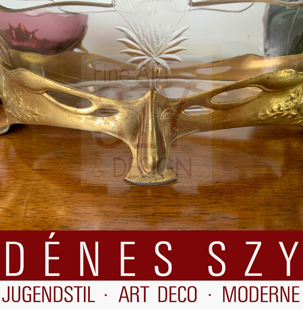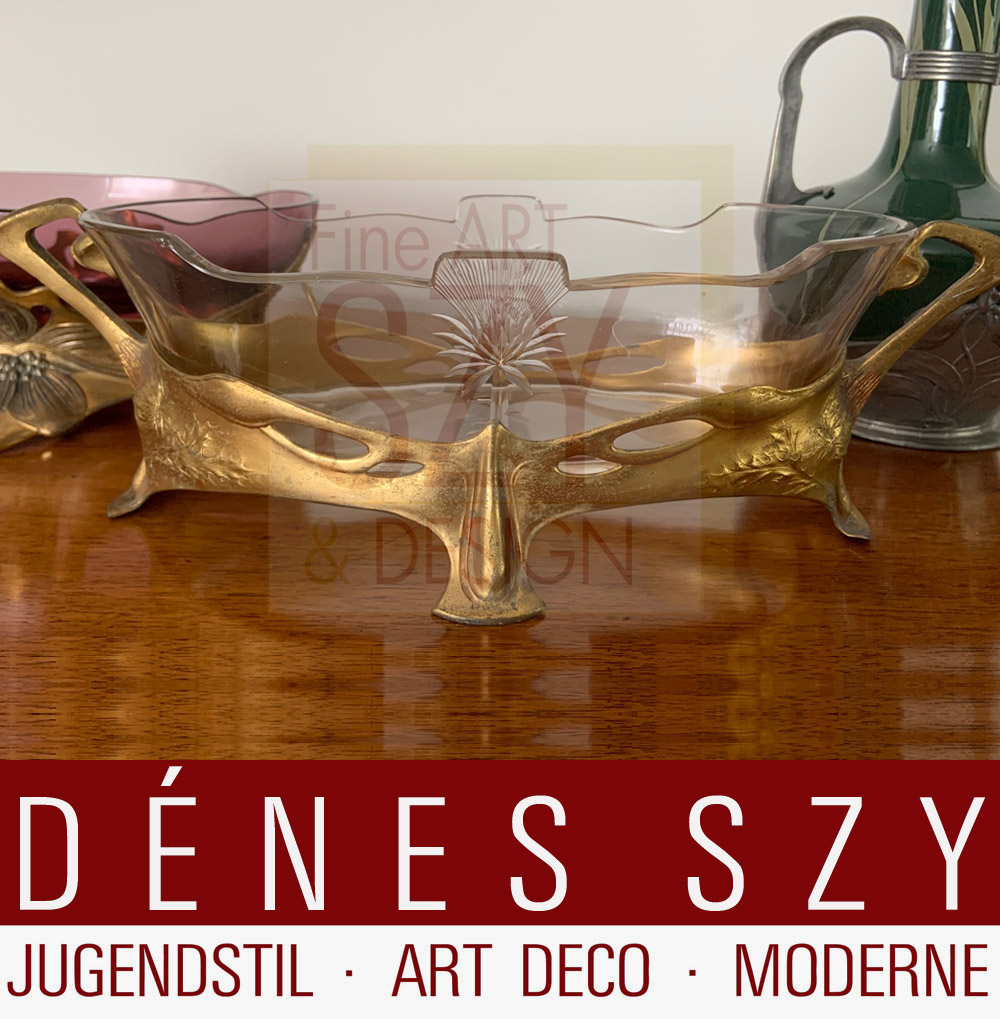Jugendstil Zinn Jardiniere #733, vergoldet, mit Distel Dekor und Glas Einsatz