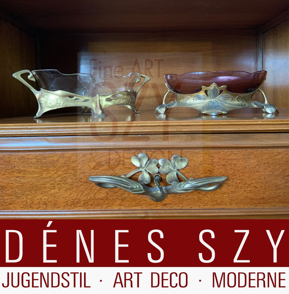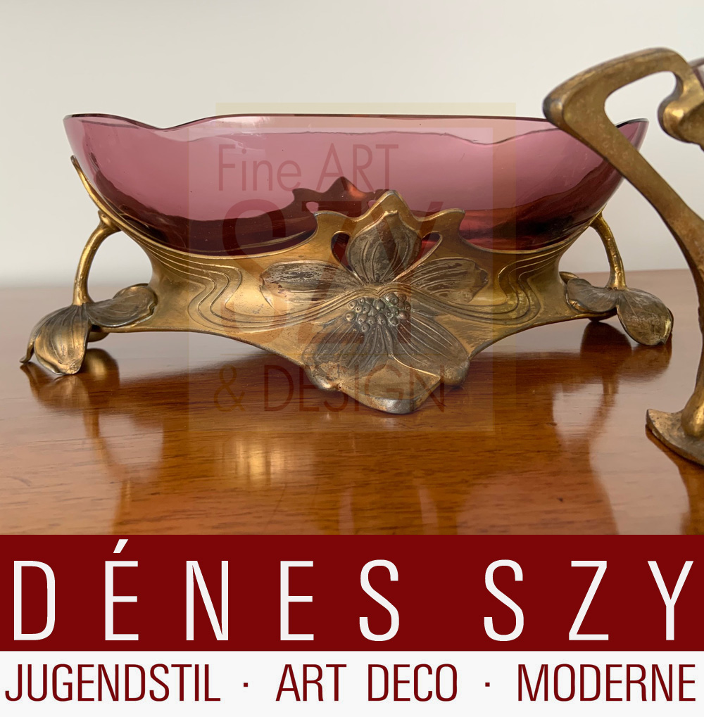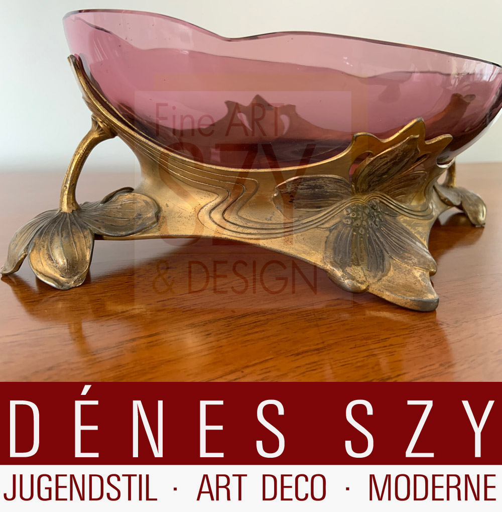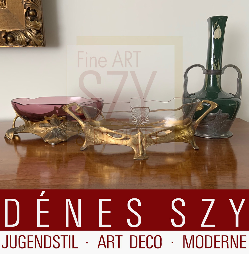 Jardiniere Art Nouveau in peltro n. 516, placcato oro con inserto in vetro mirtillo rosso, Esecuzione: “Osiris” Walter Scherf & Co., Norimberga, Germania intorno al 1900/04