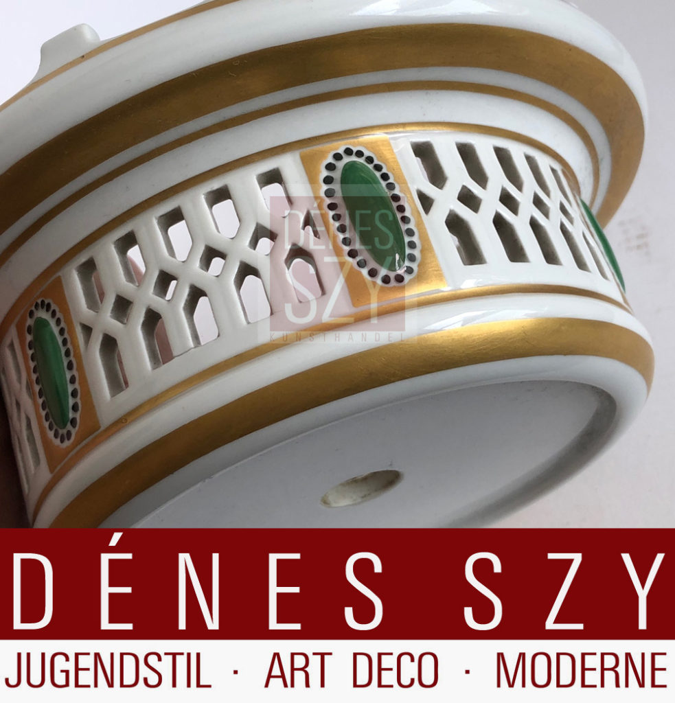 Der durchbrochene Porzellan Sockel erinnert auch an Entwürfe von Theodor Schmuz-Baudiss, etwa an die Dessertteller mit Durchbruch Rand des CERES Services.