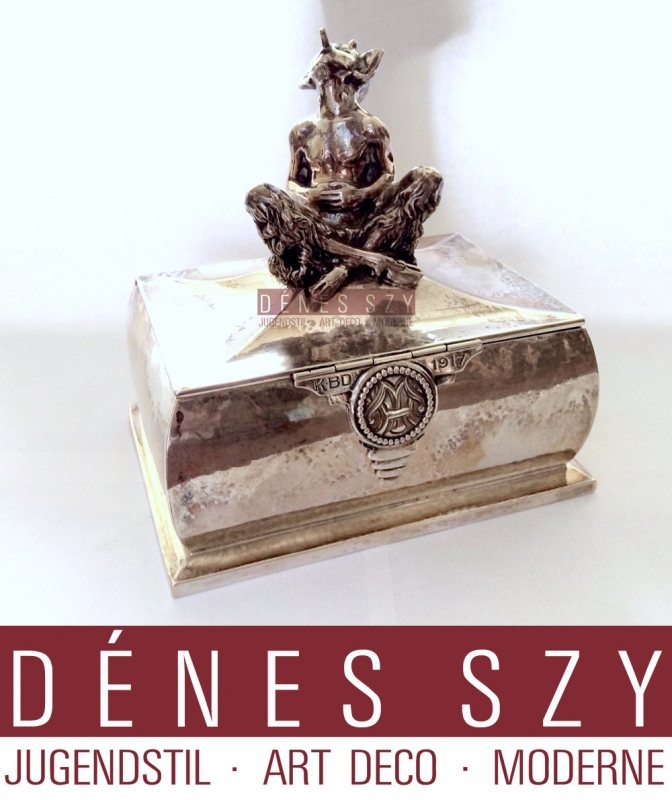 Peter Bruckmann and Sons Silversmiths, Heilbronn Germany, Design Kay Bojesen, German Art Nouveau Sterling silver unique jewelry casket box, faun knob.