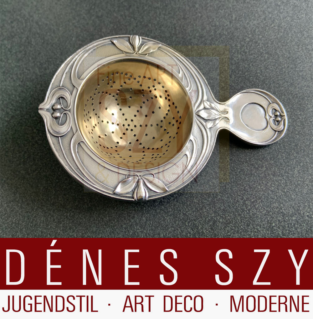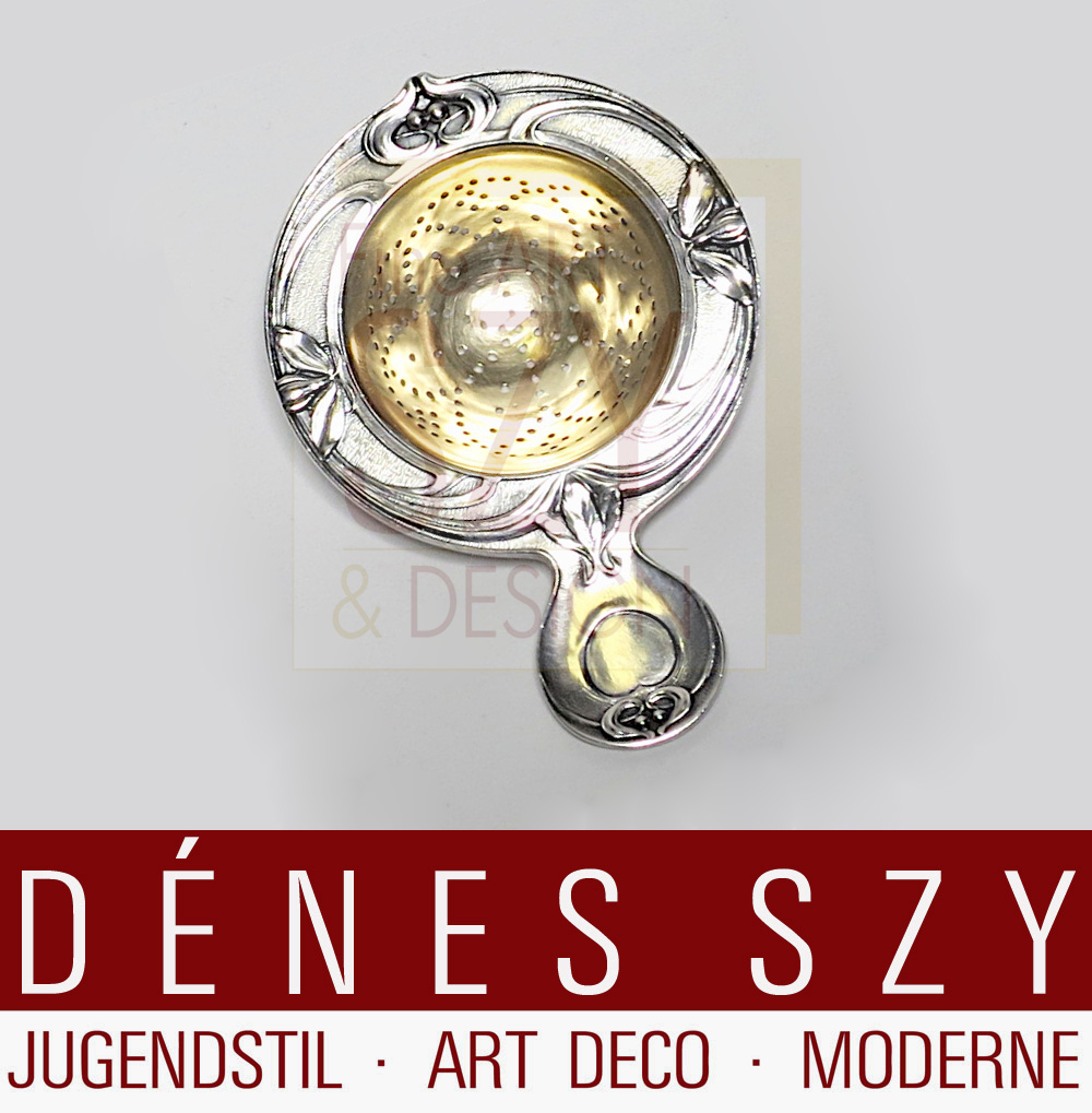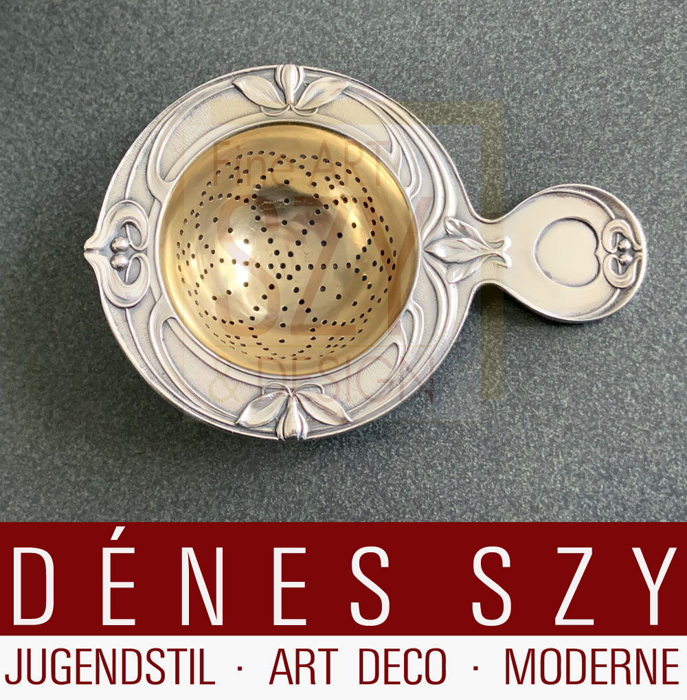Seltenes partiell vergoldetes Teesieb, ausgestellt auf Weltausstellung Paris 1900, Deutsches Jugendstil Silberbesteck, Silber 800, teilvergoldet, Besteck Muster Iris Modell-Nr. 2401, Entwurf und Ausführung: Silberschmiede Peter Bruckmann und Söhne, Heilbronn, Deutschland um 1900.