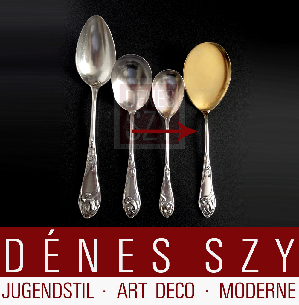 Eisvorlegelöffel GROSS aus dem WELTAUSSTELLUNGSBESTECK, # 2401, P. Bruckmann & Söhne, Heilbronn, IRIS Muster, Silber 800, teilvergoldet
