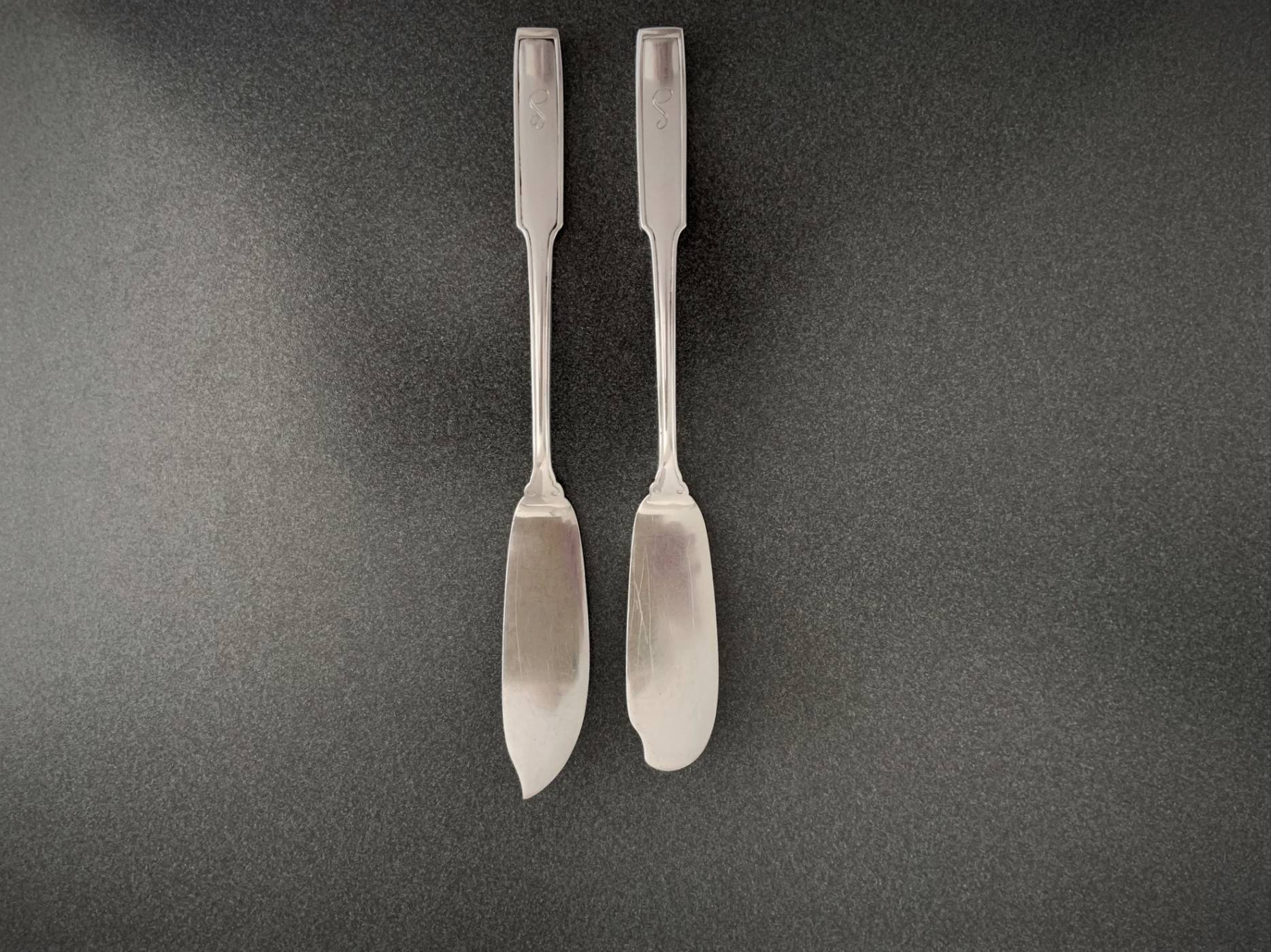 Münchener Jugendstil Buttermesser, Vollsilber, 1x 20,5 cm, 54 Gramm (Rechts im Bild)