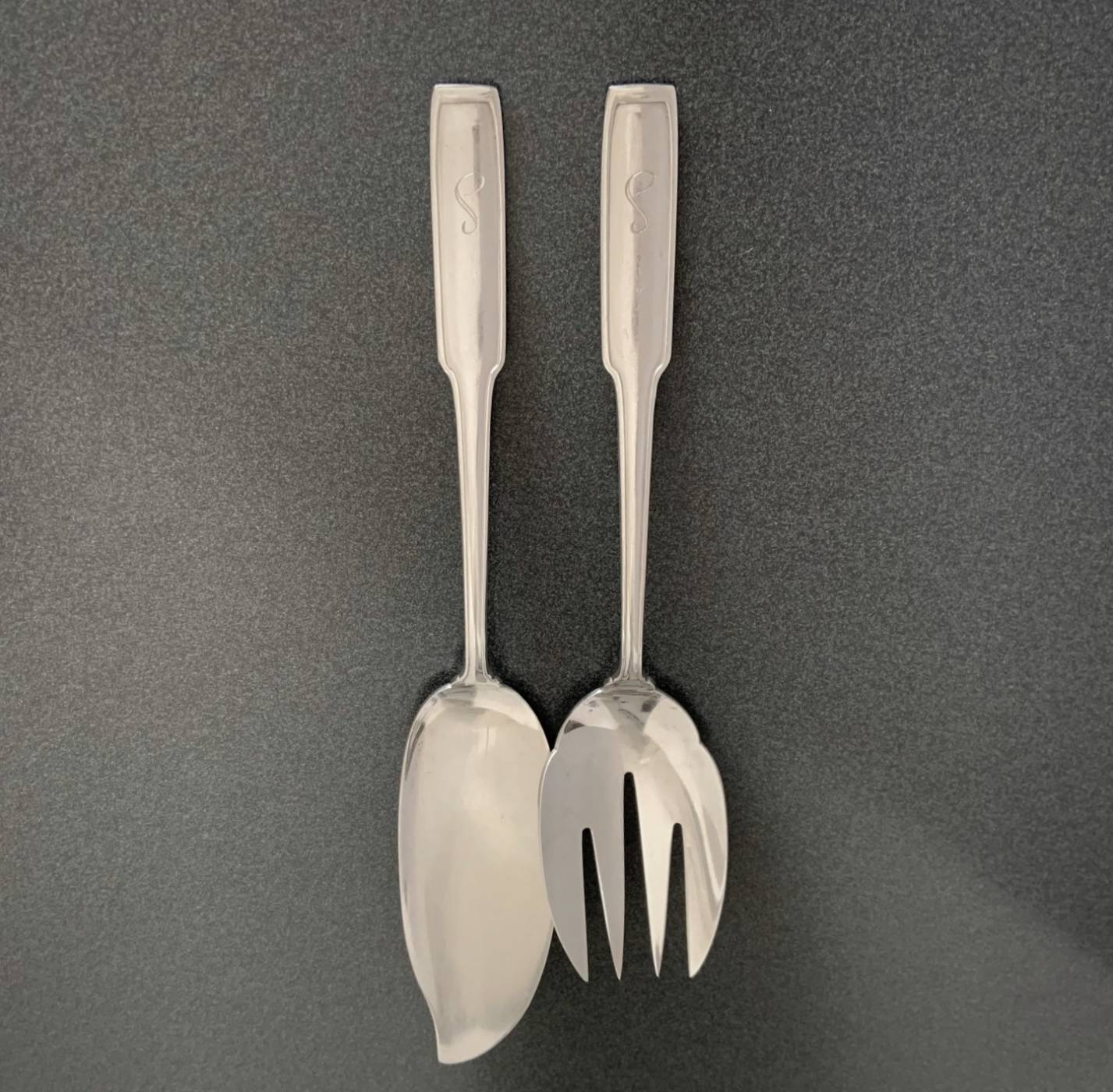 Tafellöffel, Tafelmesser und -gabel, Dessert-messer und -gabel, Kaffeelöffel, Obstmesser (Monogramm S)