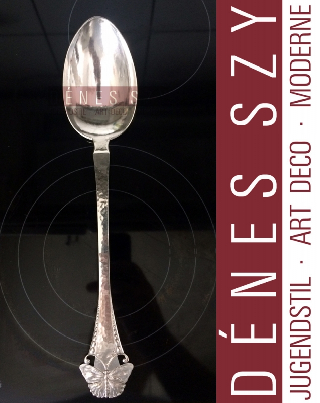 Hammerschlag Dekor, am Ende des Griffes ein plastisch ausgeformter Schmetterling als Dekoration, Jugendstil Dekor