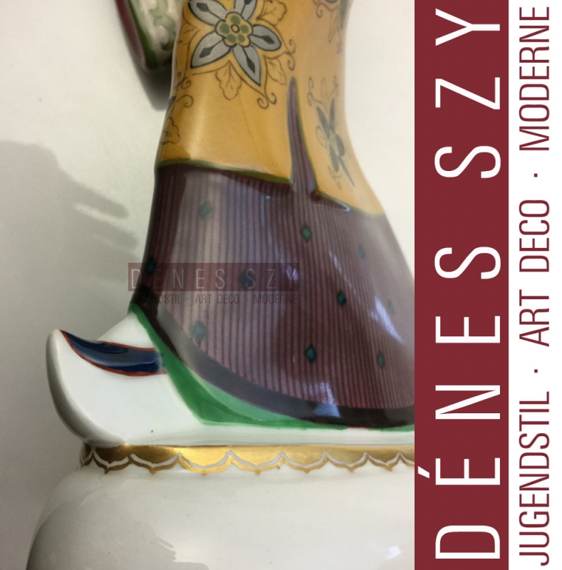 1908 erwarb dann die Königliche Porzellan-Manufaktur Berlin (KPM) unter der künstlerischen Direktion von Theo Schmuz-Baudiss den Entwurf, der über die Jahre sogar mehrfach aufgelegt wurde. Lempertz Berlin versteigert am 3. Mai in einzelnen, zwischen 500 und 5000 Euro taxierten Losen einen nahezu kompletten Figurensatz der ersten Serie von 1910 – darunter die schönlinige „Chinesin mit Papagei“, deren plastische Reize unter dem fließenden Hanfu verboten durchschimmern. » 24.04.2017 – Stefan Weixler – Artikel Weltkunst verboten durchschimmern. » 24.04.2017 – Stefan Weixler – Artikel Weltkunst