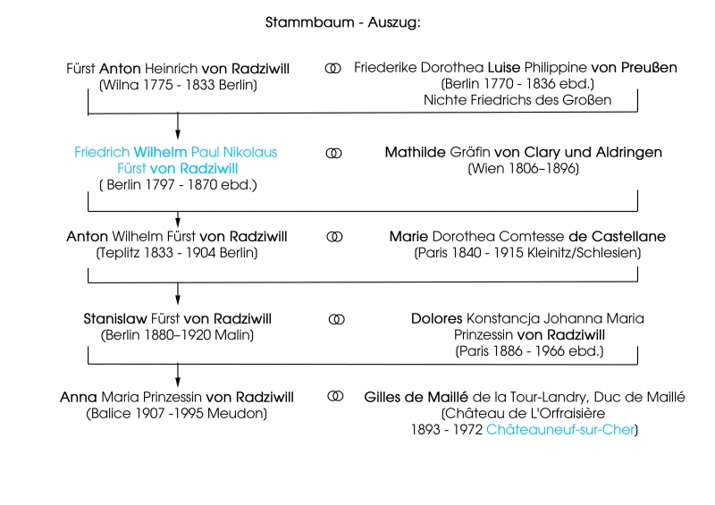Der Polnische Adlige Anton Heinrich Radziwill (1775 – 1833) kam – wie viele mit ihm zu Beginn der Teilung Polens in der zweiten Hälfte des 18. Jh. – nach Berlin. Der Komponist, der dort Goethes Faust vertonte, heiratete nach zähen Verhandlungen mit dem Preußischen Hof schließlich 1796 die Nichte Friedrich des Großen, Luise von Hohenzollern, was der Familie für mehr als hundert Jahre die Verbindung in die höchsten Kreise der Berliner Gesellschaft verschaffte. Diese Ehe hatte zudem politischen Charakter und war von großer Bedeutung für die Monarchie der Hohenzollern. Indem der preußische König den Vertreter eines für Polen so wichtigen Geschlechts in seine Familie aufnahm, erlangte er indirekt eine Bestätigung der Akzeptanz der Polen für die vorgenommene Teilung. Als auf dem Wiener Kongress die Entscheidung über die Schaffung des von Preußen abhängigen, aber autonomen Großherzogtums Posen fiel, wurde Anton Heinrich Radziwill 1815 der erste Statthalter. Sein Sohn Wilhelm von Radziwill residierte seit Beginn der 1820er Jahre in Posen, wo er sich Schloss Antonin als Wohnsitz von Karl Friedrich Schinkel errichten ließ (1822-24). Der erste historisch erwähnte Vorfahre des Familienstammes bezeugte als Königshofbeamter und Kastellan von Vilnius 1413 die Unterzeichnung der Union zwischem dem Königreich Polen und dem Großherzogtum Litauen.