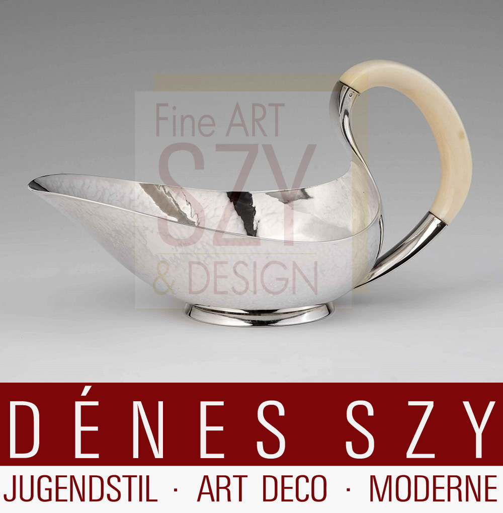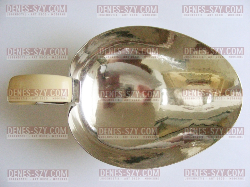 Anspruchsvoll gearbeitete, große modernistische Sauciere aus den 50er Jahren. Sowohl fürs Gießen als auch mit Saucenlöffel benutzbar.
