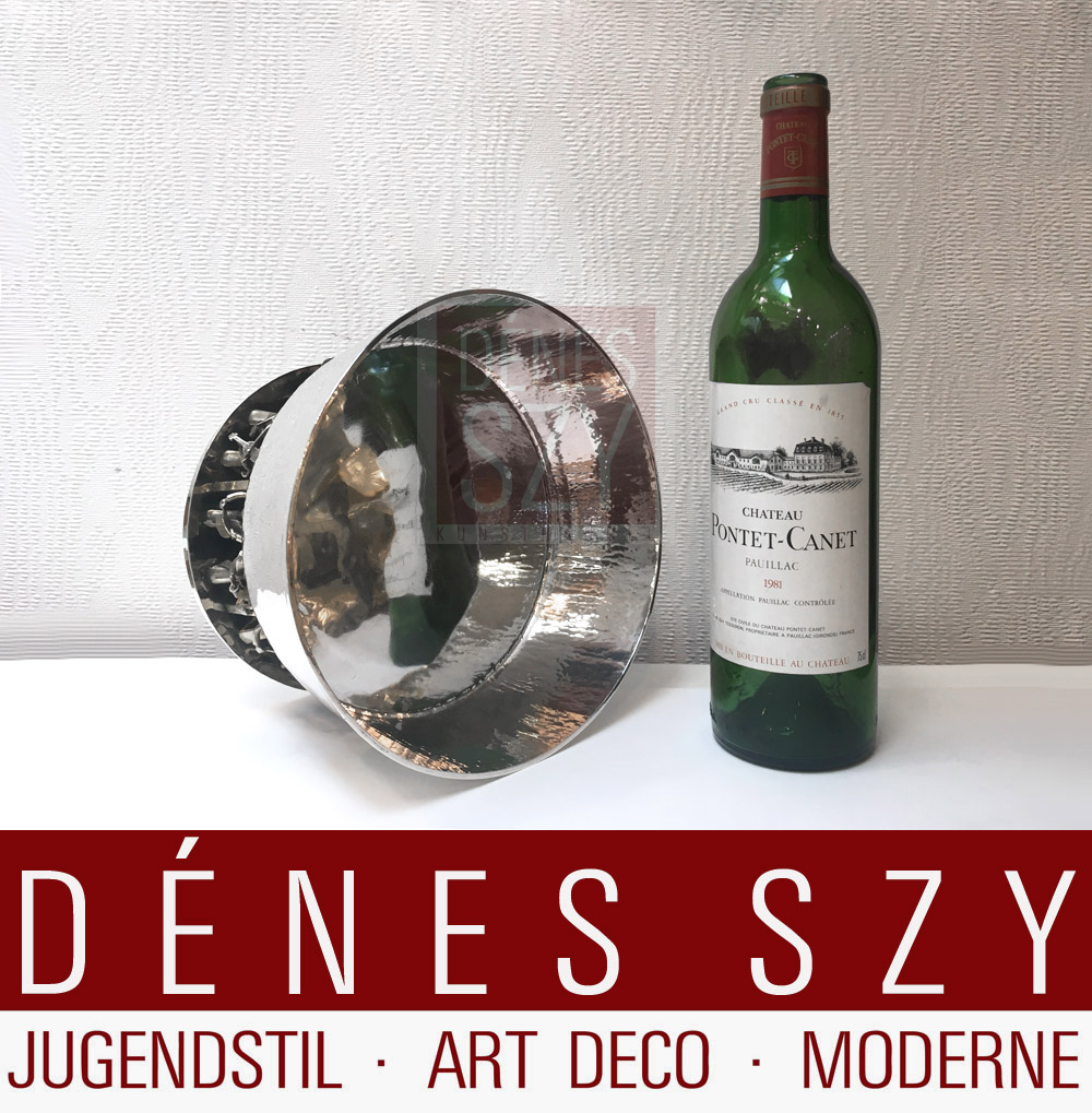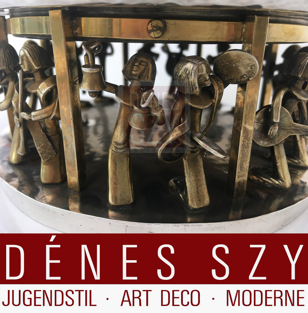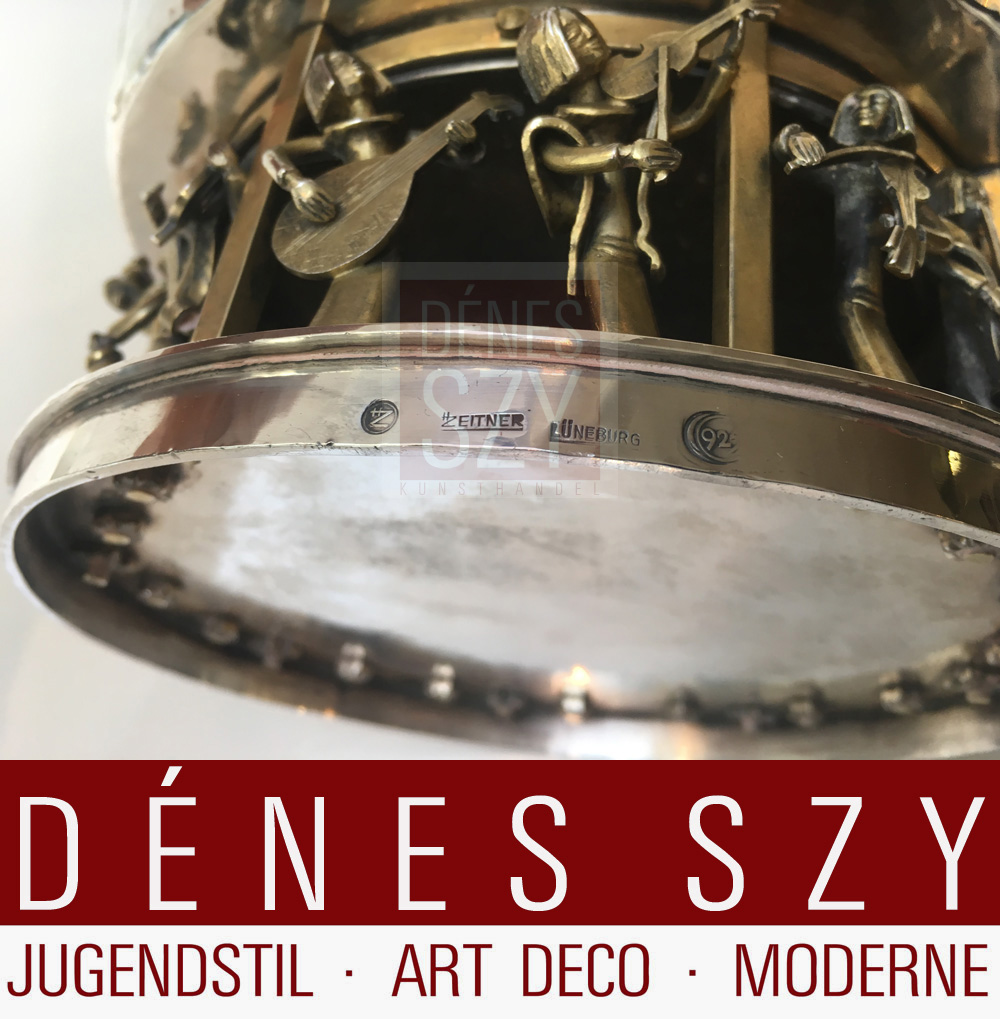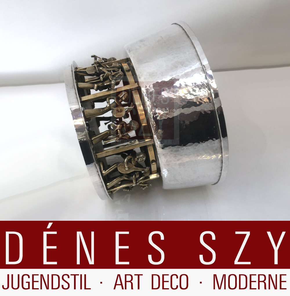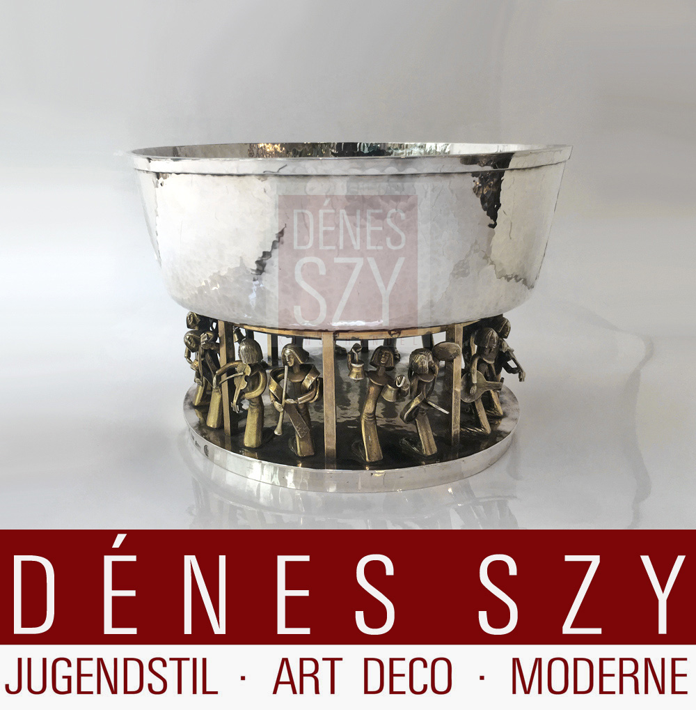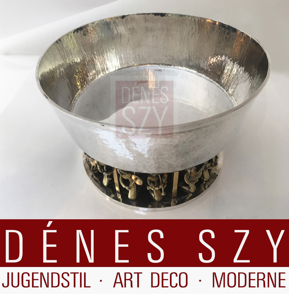 Coupe XL en argent de Herbert Zeitner des années 1940 avec figures d’anges Grande coupe d’argent imposante Conception et exécution: Herbert Zeitner, Lüneburg, années 1940 Argent sterling, martelé, partiellement doré Tout autour des figures angéliques jouant des instruments; tous travaillés individuellement, dorés et individuellement vissés au pied Mesures: hauteur 14 cm, diamètre supérieur à 21,5 cm, – 1 pouce (pouce) = 2,54 cm – Poids 1983 g. Le bol prend son origine conceptuelle dans un dessin Zeitner de ses années berlinoises 1932-1935. Ici, pour la première fois, les figures d’anges significatives sont utilisées sur le support d’un bol. Condition: très bon