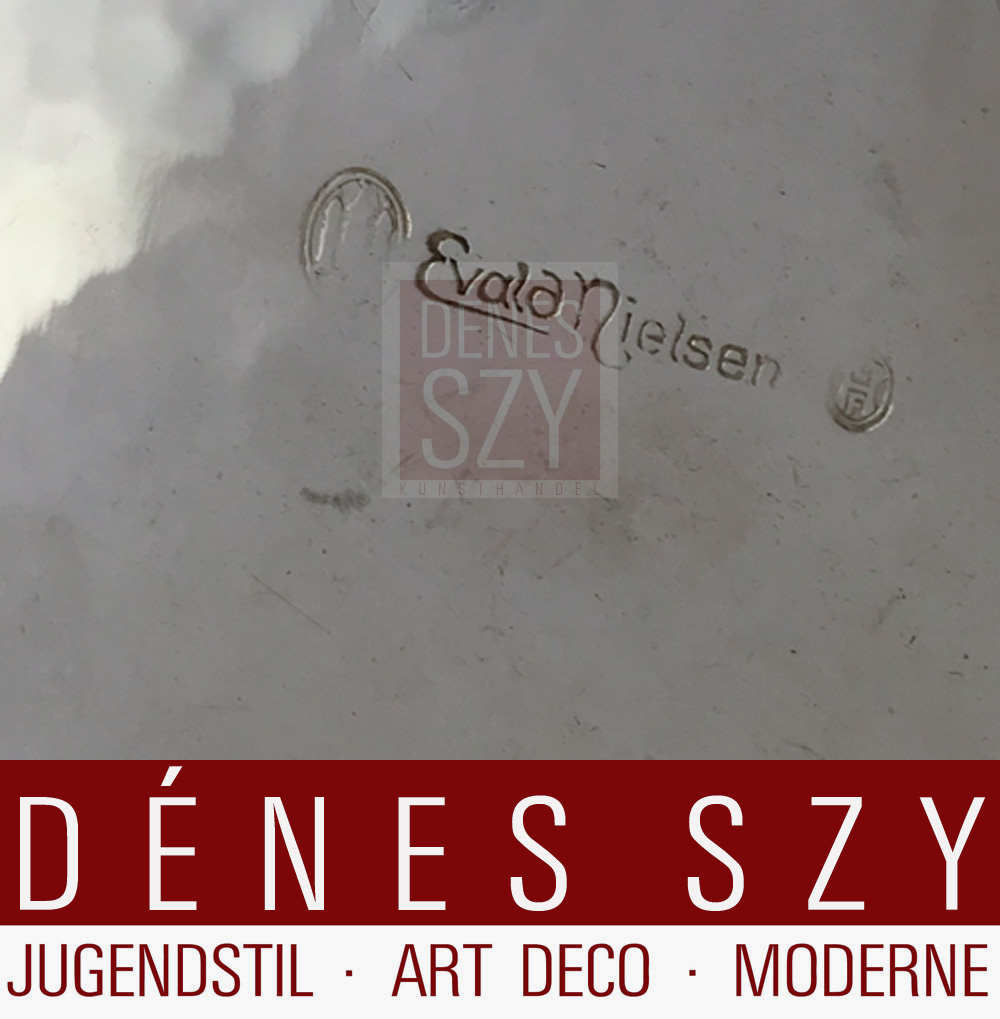 Evald Nielsen [Falster 1879 – 1958 Kopenhagen], dänischer Silberschmied. Aus armen Verhältnissen stammend, ging Nielsen 1893 in die Lehre als Maschinenbediener, danach als Stahlgraveur. 1900 bereiste er Deutschland, die Schweiz und Frankreich, um dort zu arbeiten. Ebenfalls besuchte er die Weltausstellung in Paris. 1905 eröffnete er seine eigene Werkstatt in Kopenhagen und arbeitete dort sowohl als Silberschmied als auch als Graveur, um sein Einkommen zu sichern. Mehr und mehr konzentrierte er sich erfolgreich auf Silber Korpusarbeiten, Schmuck und Bestecke, 1914 arbeiteten bereits 14 Angestellte für ihn. (Nielsen, Evald)