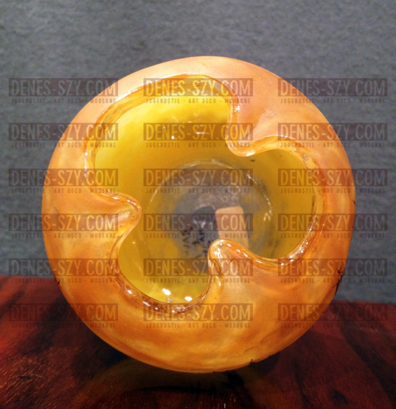 farbloses Glas mit dichten orangen, im unteren Teil auch ockergelben Einschmelzungen, außen umlaufend geätzte Seelandschaft mit Segelbooten, rauh geätzter Grund