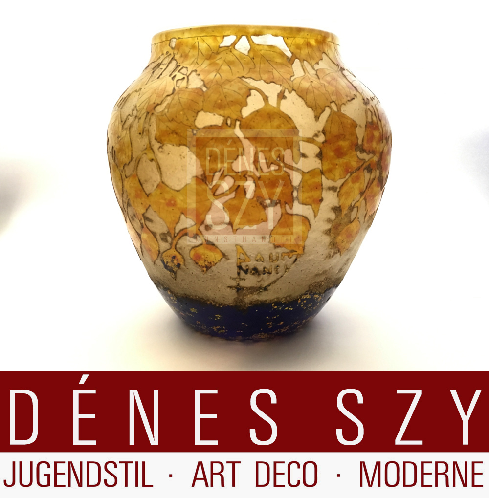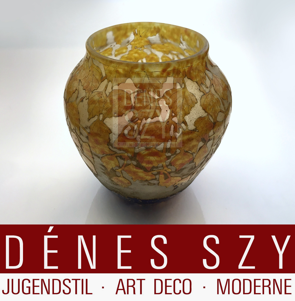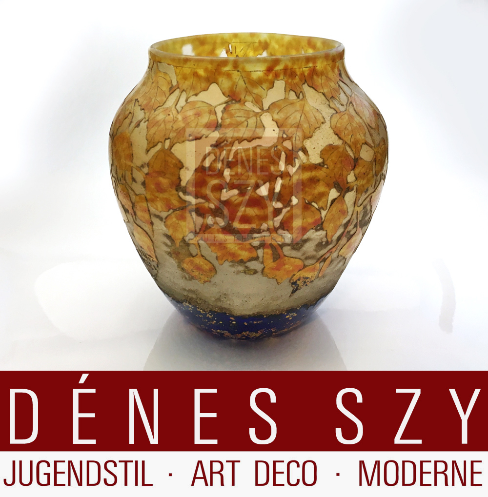 Jugendstil Glas Vase von Daum Nancy, Ecole de Nancy, France ca. 1900 mit Herbstlaubdekor in Gelb- und Orangetönen und einem warmen, dunklen Blau