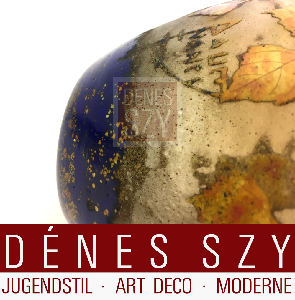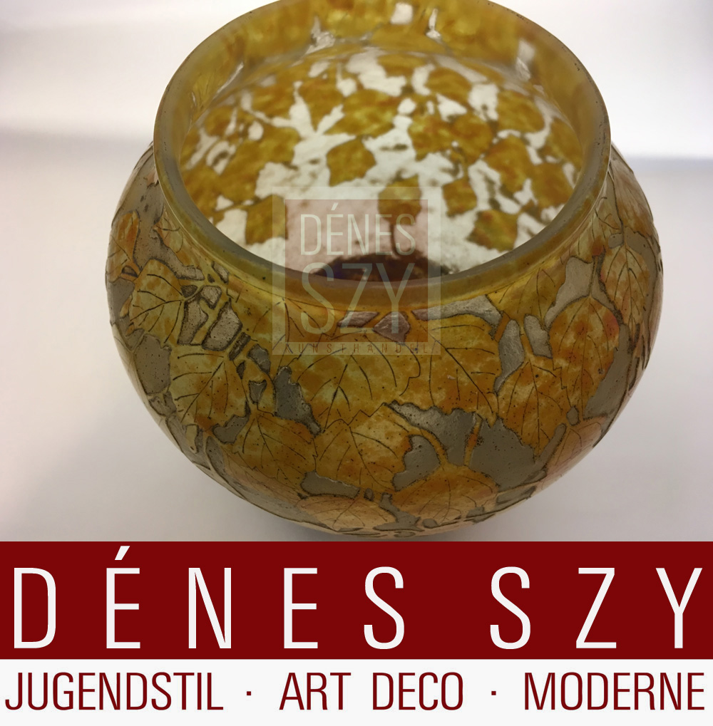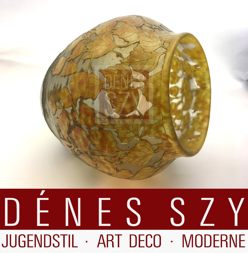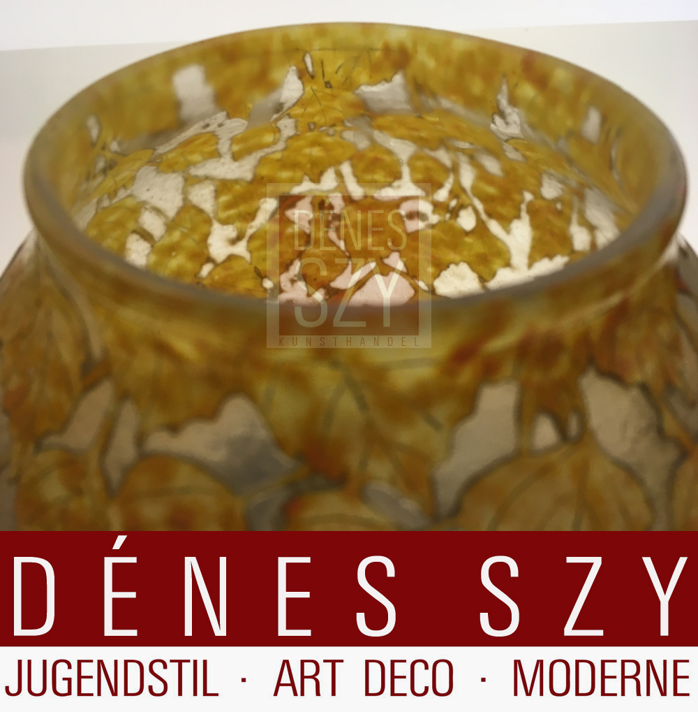Jugendstil Glas Vase von Daum Nancy, Ecole de Nancy, France ca. 1900 mit Herbstlaubdekor in Gelb- und Orangetönen und einem warmen, dunklen Blau