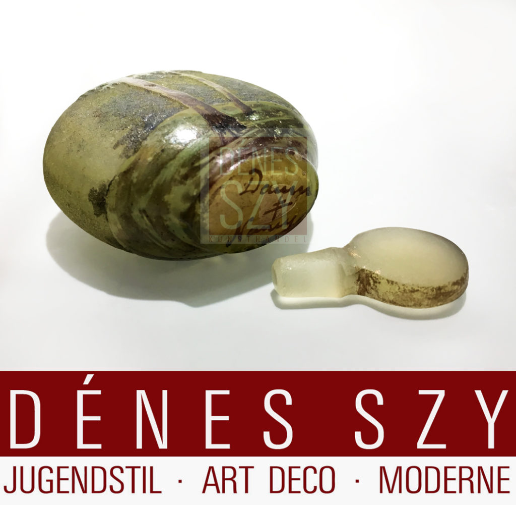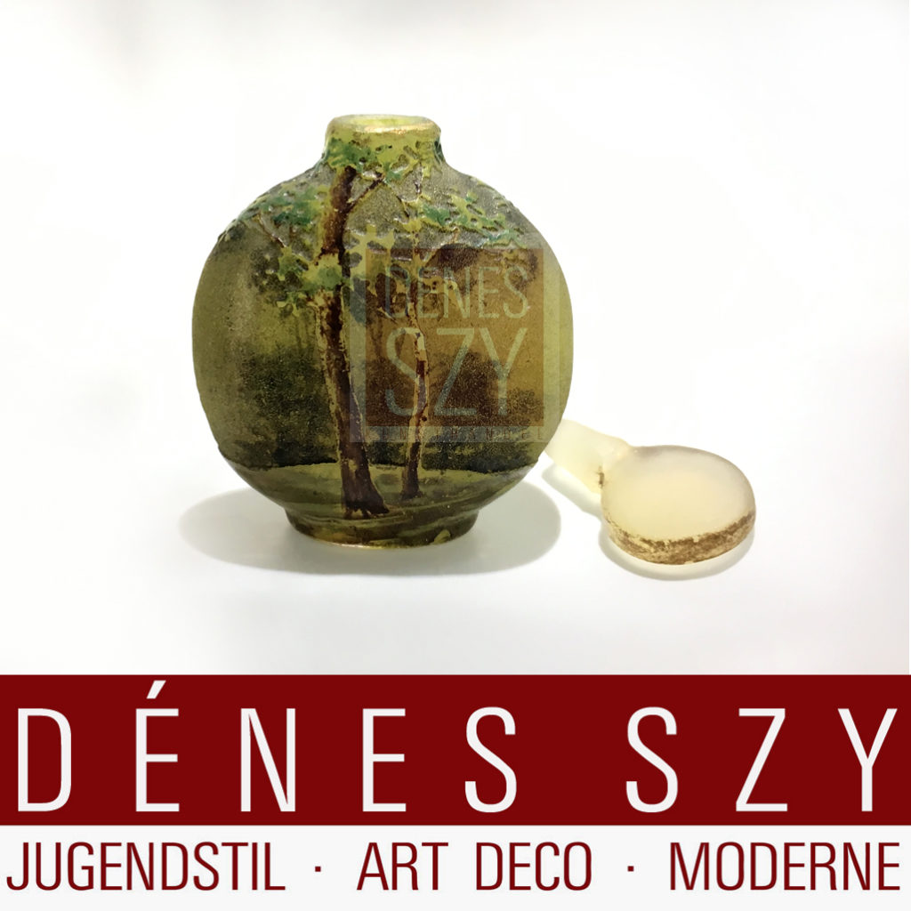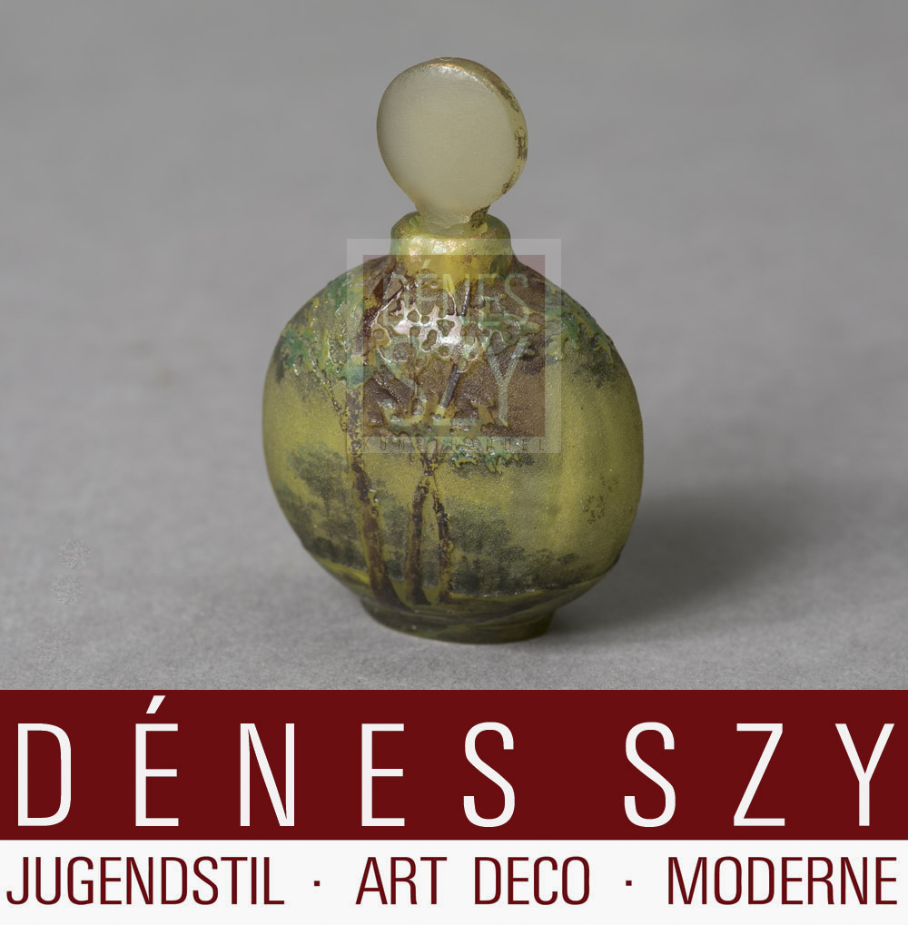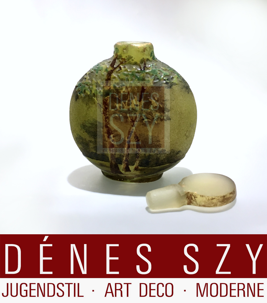 farbloses Überfangglas mit dichten gelben und grünlichen Farbpulvereinschmelzungen; durchgehend geätzter Dekor mit einer Waldlandschaft, dieser überhöht mit polychromen Emailledekor; obere Umrandung des Stöpsels zum Teil vergoldet; Unterseite in schwarz bezeichnet Daum Nancy mit Lothringerkreuz; H. 5,7 cm.