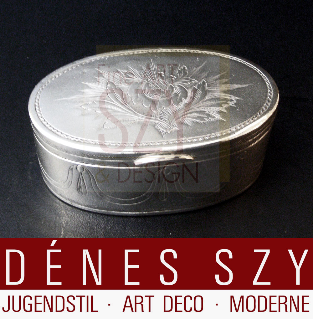 Dose, klassizistisch. Ovale Form, graviert mit Tuchfestons und Blumenmotiven