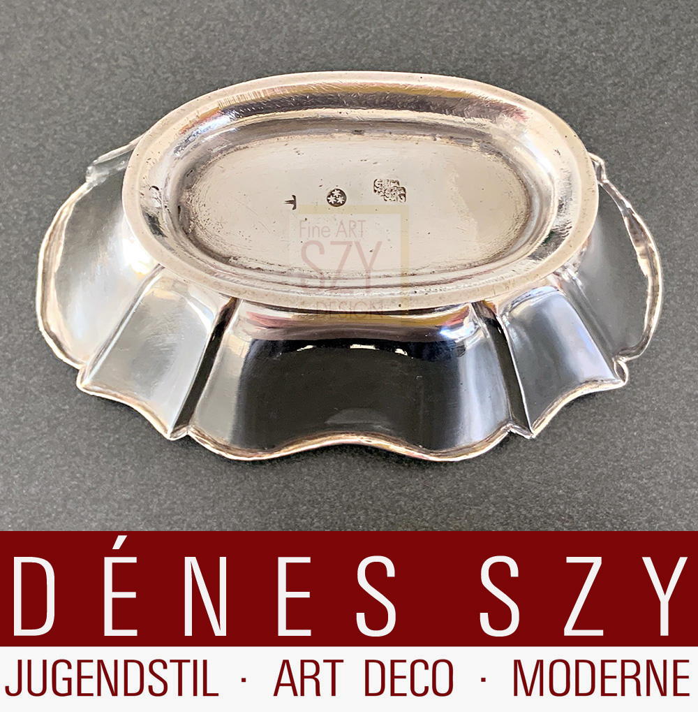 Kandisschale, Silber, getrieben. Auf eingezogenem Standring oval fassonierte Schale mit geraden Faltenzügen. Marken: BZ Düsseldorf mit Jahresbuchstabe T für 1737/38, MZ Meister mit drei Sternen (1724 – 40, Clasen Nr. 464, 499 b, 595). B 15,5; T 10,5; H 4 cm, Gewicht 121 g.