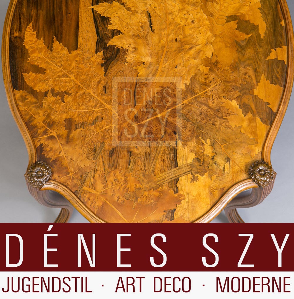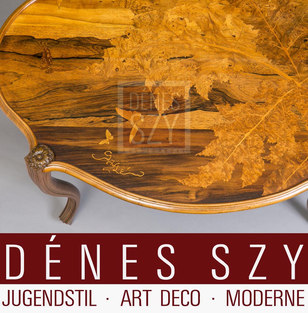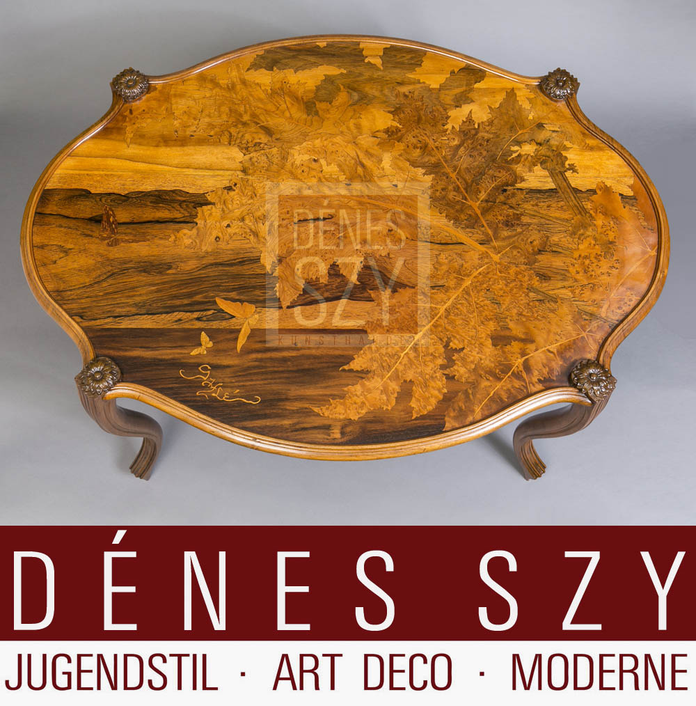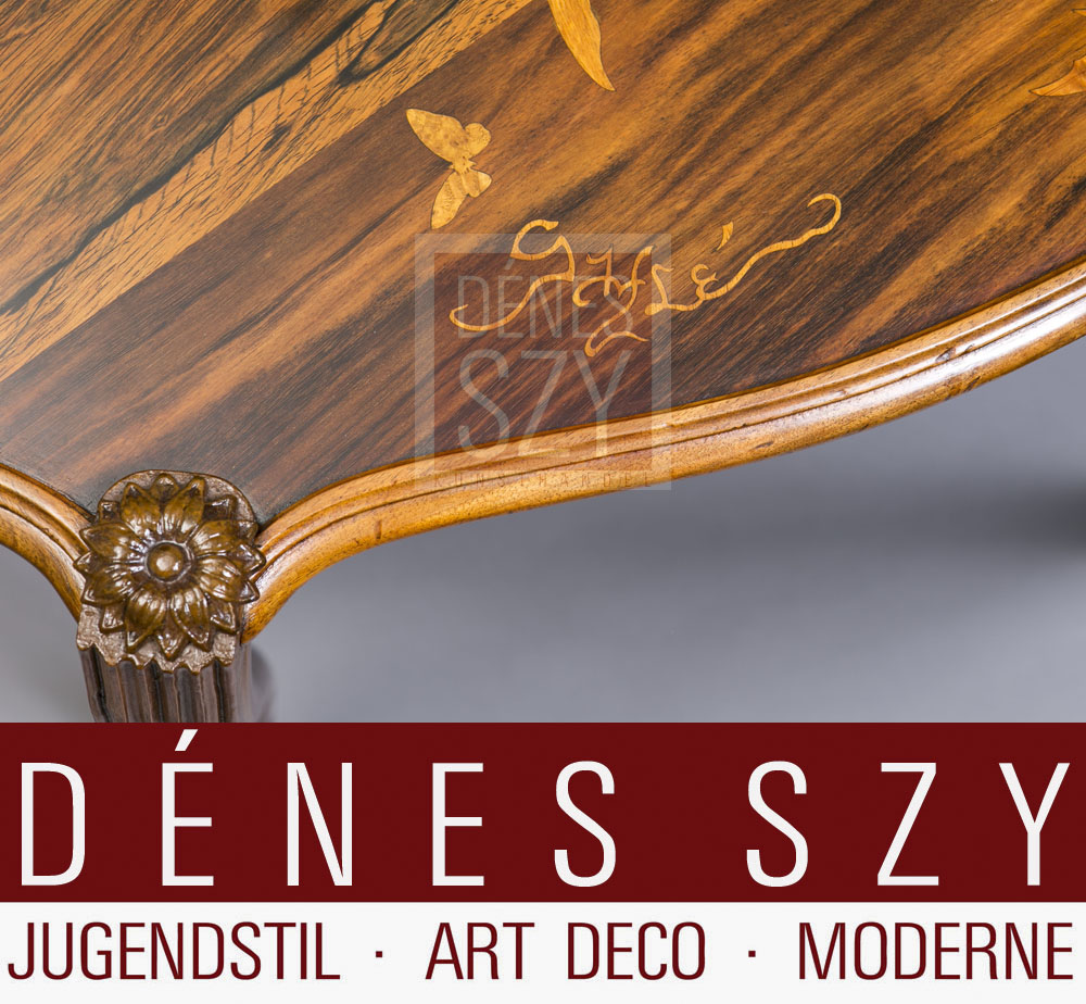 Emile Galle Nancy 1900 französische Jugendstil Salon Möbel ovaler Sofatisch mit Blatt Dekor und Schmetterlingen, Edelhölzer