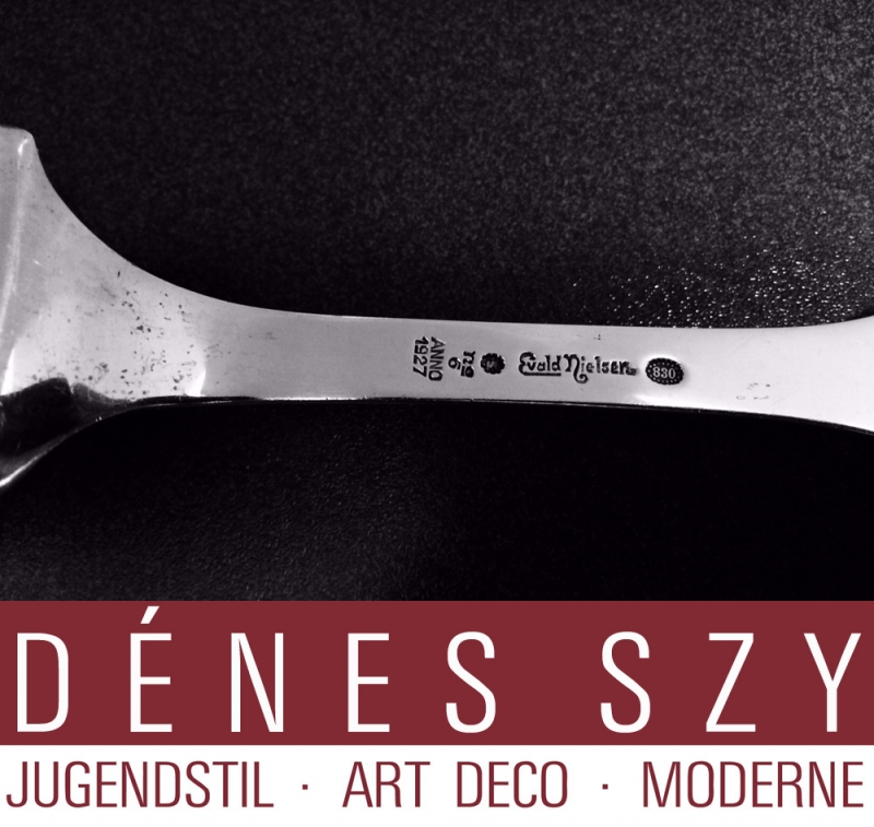 Evald Nielsen [Falster 1879 – 1958 Kopenhagen], dänischer Silberschmied. Aus armen Verhältnissen stammend, ging Nielsen 1893 in die Lehre als Maschinenbediener, danach als Stahlgraveur. 1900 bereiste er Deutschland, die Schweiz und Frankreich, um dort zu arbeiten. Ebenfalls besuchte er die Weltausstellung in Paris. 1905 eröffnete er seine eigene Werkstatt in Kopenhagen und arbeitete dort sowohl als Silberschmied als auch als Graveur, um sein Einkommen zu sichern. Mehr und mehr konzentrierte er sich erfolgreich auf Silber Korpusarbeiten, Schmuck und Bestecke, 1914 arbeiteten bereits 14 Angestellte für ihn. (Nielsen, Evald)