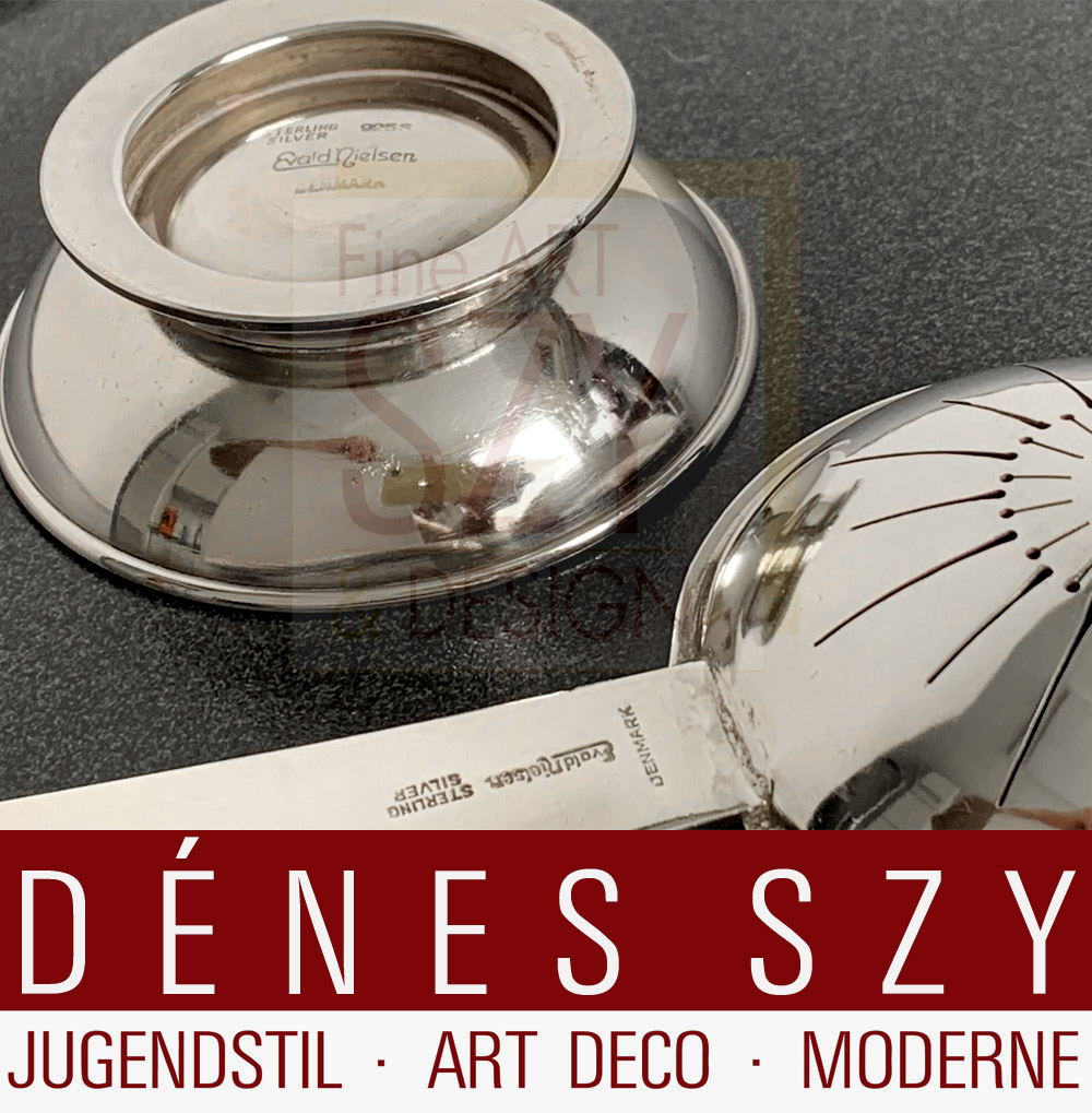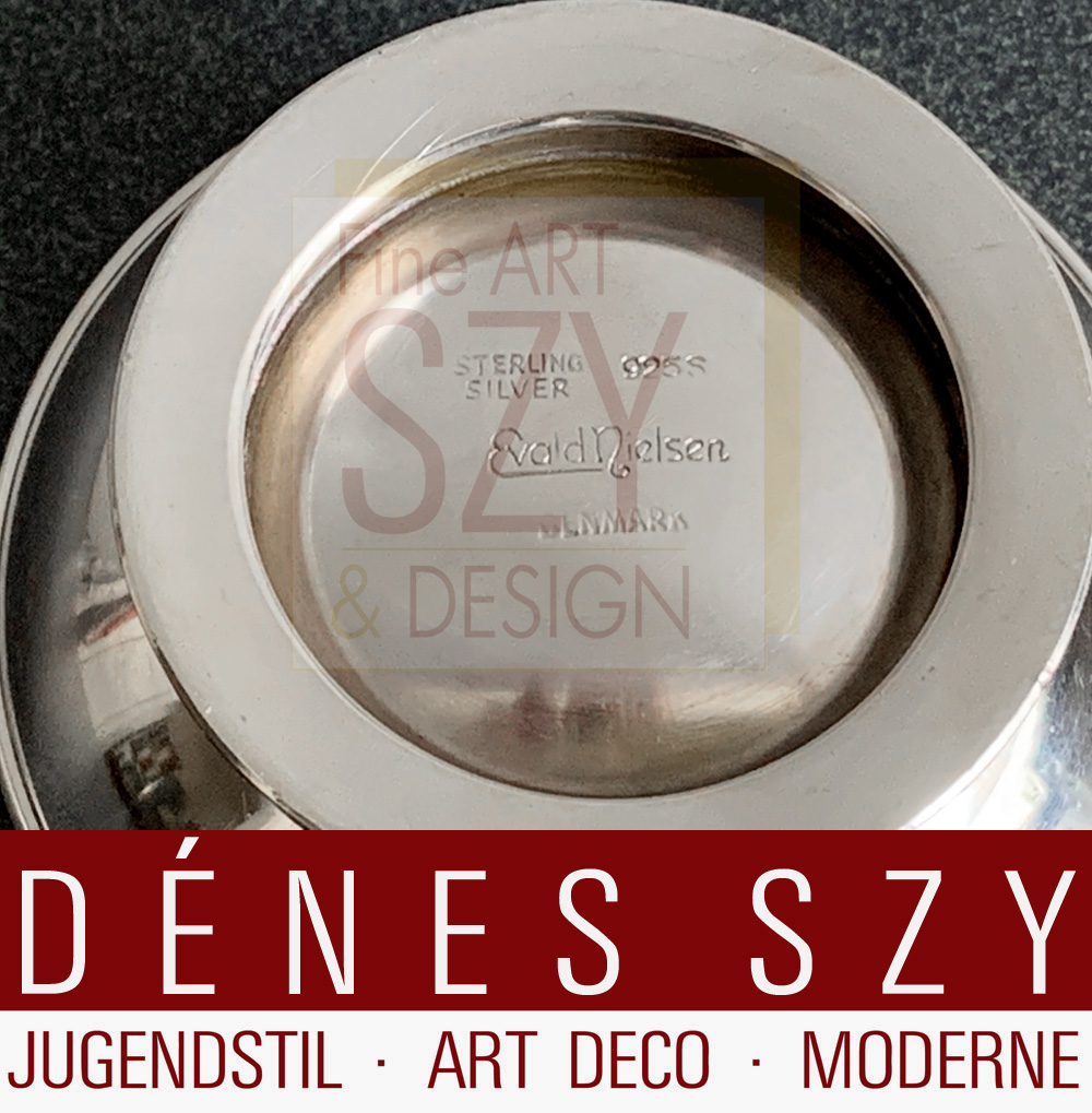 Es handelt sich um einen der markantesten Art Deco Entwürfe der Evald Nielsen Silberschmiede, erdacht von Aage Weimar, dem Sohn Evald Nielsens.