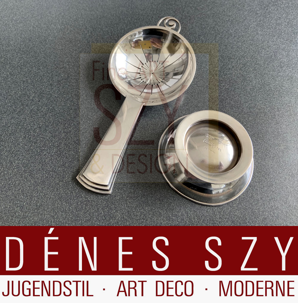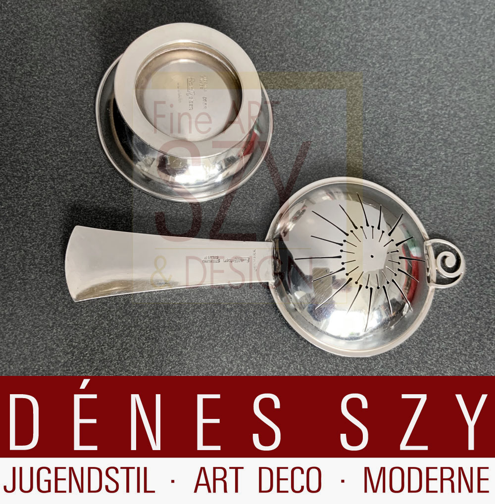 handgeschmiedetes Art Deco Silberbesteck, Teesieb mit Untersatz