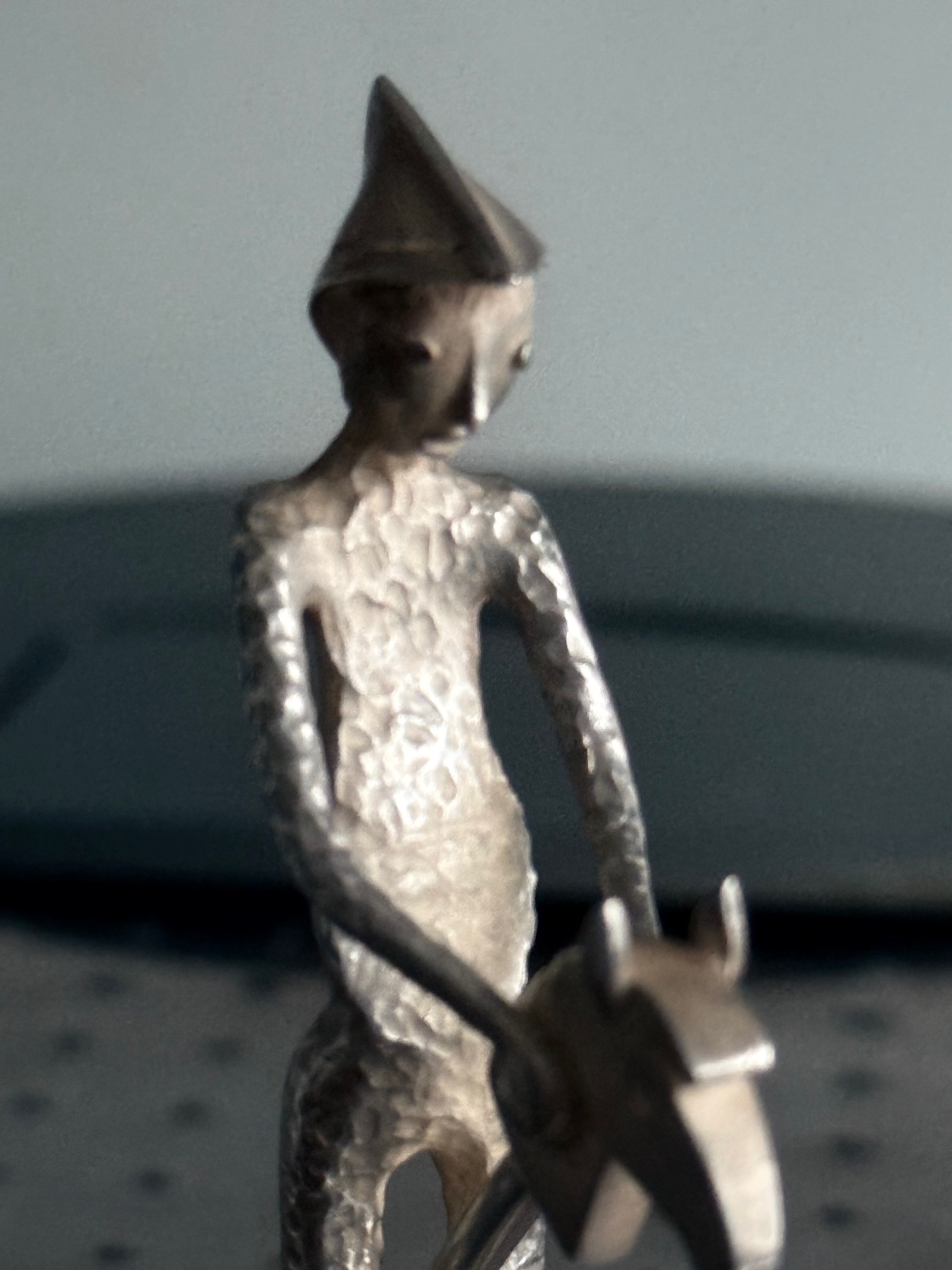 Kleine, zierliche Statue eines jungen Mannes mit Stecken und Papierhut, gestaltet im Stil der 1950er Jahre. Die Figur zeigt fein modellierte Gesichtszüge und eine elegante Haltung. Teils gegossen, teils handgearbeitet mit Hammerschlagdekor, gefertigt aus hochwertigem 925er Silber.