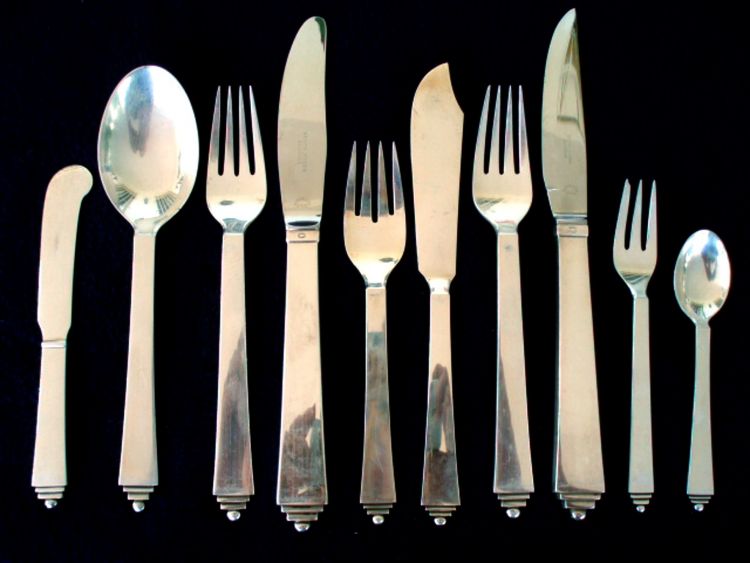 Georg Jensen silversmiths Design Harald Nielsen Pyramid pattern Art Deco Sterling Silver cutlery hand crafted Silverware 88 pieces Copenhagen 1930s Denmark.