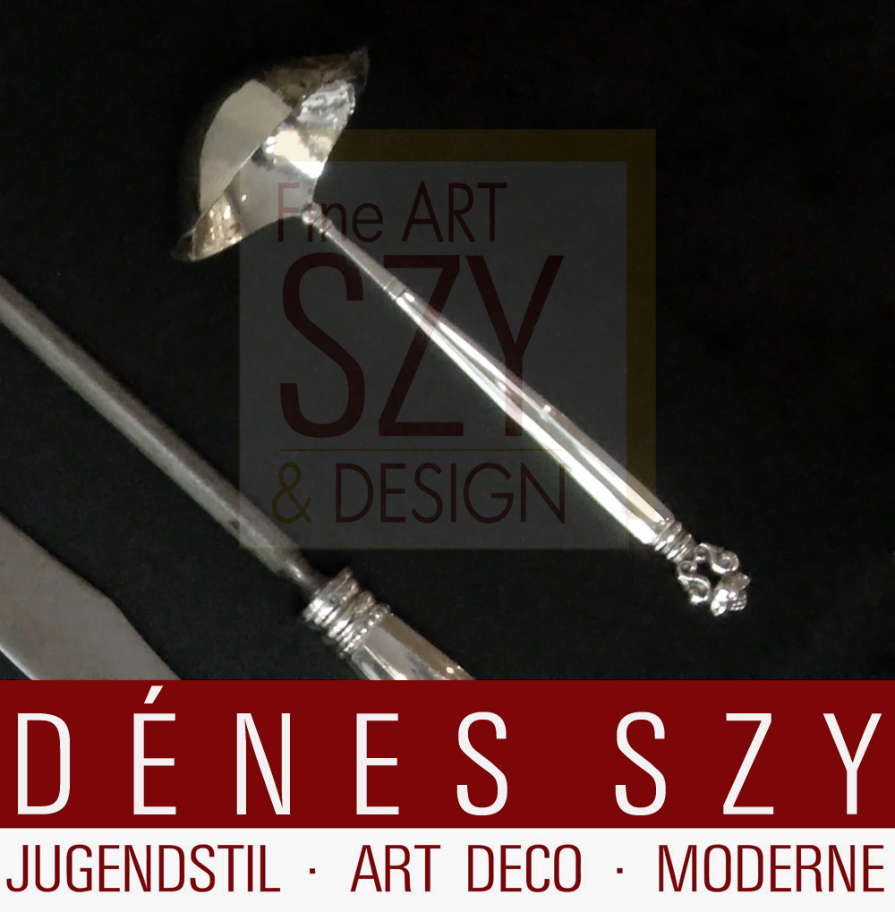 Johan Rohde [1856 – 1935], dänischer Maler, Grafiker und Designer. 1907 besuchte Johan Rohde, der große Erfolge mit seinem avangardistisches Stil in der Malerei in Dänemark und auch in Deutschland feierte, Georg Jensen in seiner noch jungen Silberschmiede. Von nun an entwarf Johan Rohde für Georg Jensen, der diese Entwürfe umsetzte und produzierte. Aus diesem produktiven Beginn wurde eine lebenslange Freundschaft zwischen den beiden. Am erfolgreichsten sollte sein Besteck Entwurf Muster KÖNIG oder ACORN werden, gleichauf mit dem mitlerweile zu den Design Klassikern zählenden Krug # 432 von 1920.