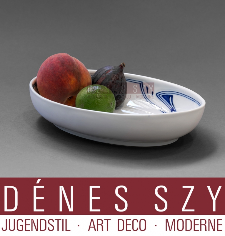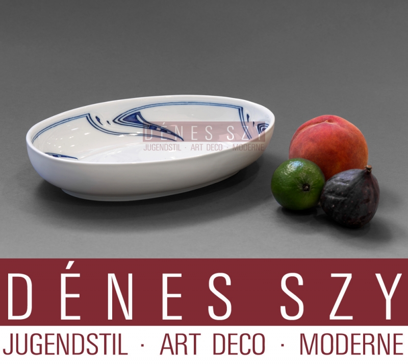 Ciotola ovale stile liberty in porcellana di Meissen, Henry van de Velde motivo frustata di blu cobalto porcellana in stile liberty Design: Henry van de Velde, 1903 Execuzione: manifattura Reale delle porcellane di Meissen 1905-10 marche: spade incrociate e monogramma di van de Velde (timbro pressato), marche pressate dimensioni: 26,4 x 18,5 cm, altezza 4,7 cm — 1 Inch (Zoll) = 2,54 Zentimeter — in condizione molto buona, prima scelta Provenienza: Casa Schulenburg, Gera, Turingia