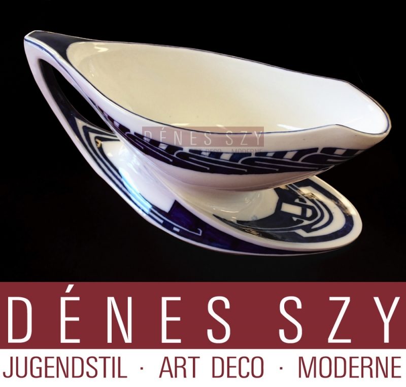 Porzellan, Porseleinen serviesonderdelen van Henry van de Velde (1863-1957), voor Meissener Porzellanmanufaktur, 1903-1904, Seite 78. Porzellan Sauciere, Brötchenteller, Eßteller, Muster Peitschenhieb in Kobalt Blau