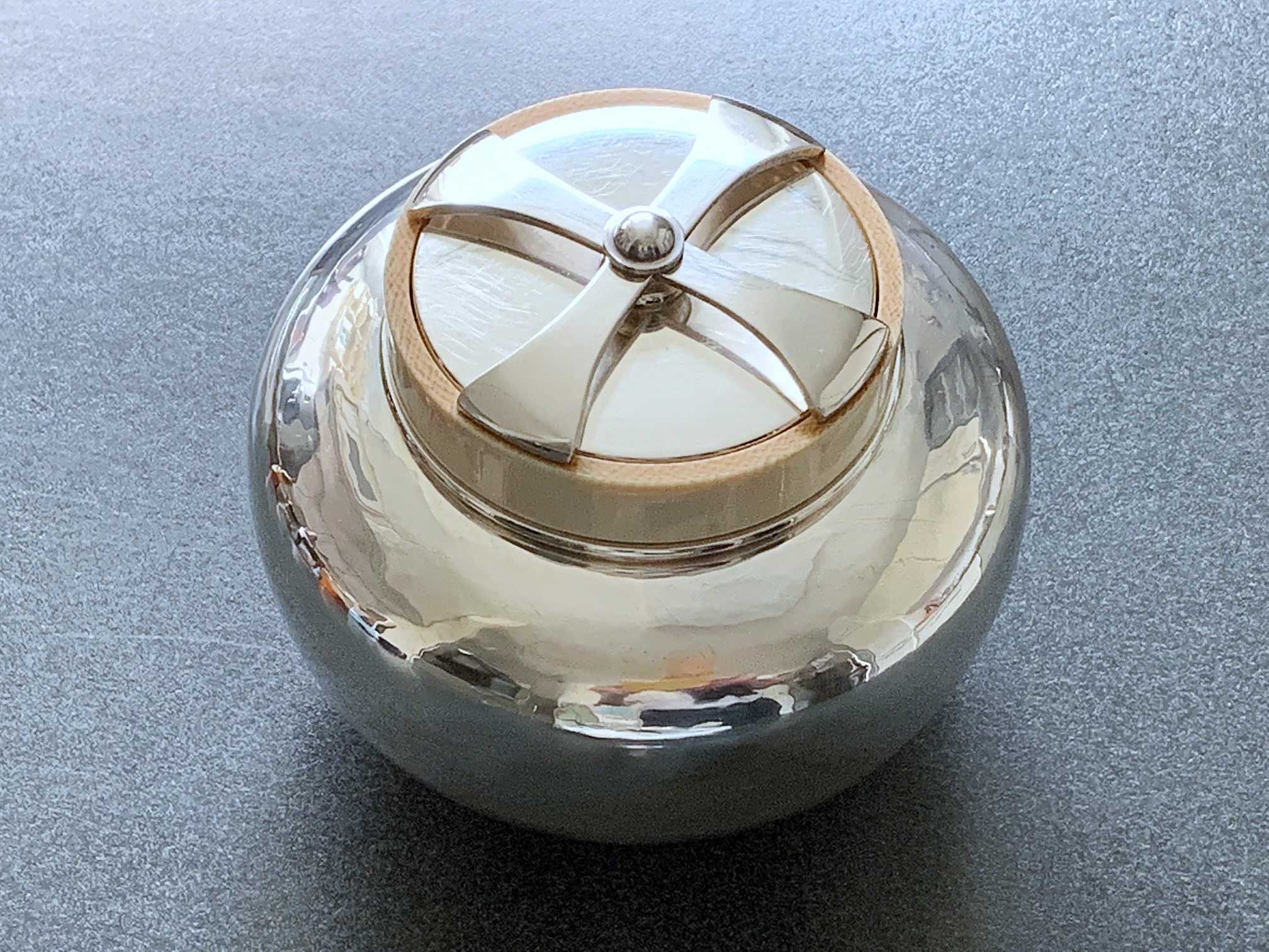 The caddy has a rounded, swelling body on a circular base with a removable lid. A distinctive applied cross motif crowns the lid, a defining feature of the service. The rim is mounted with ivory, while the interior is gilt. The restrained geometry and carefully balanced proportions demonstrate Van de Velde’s characteristic synthesis of structural clarity and organic line.