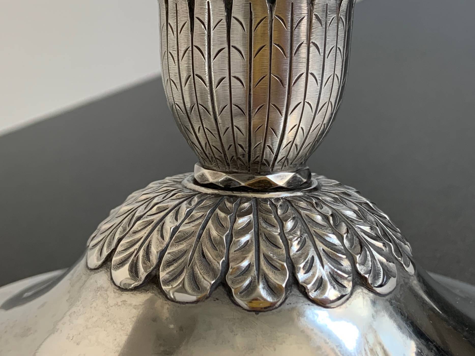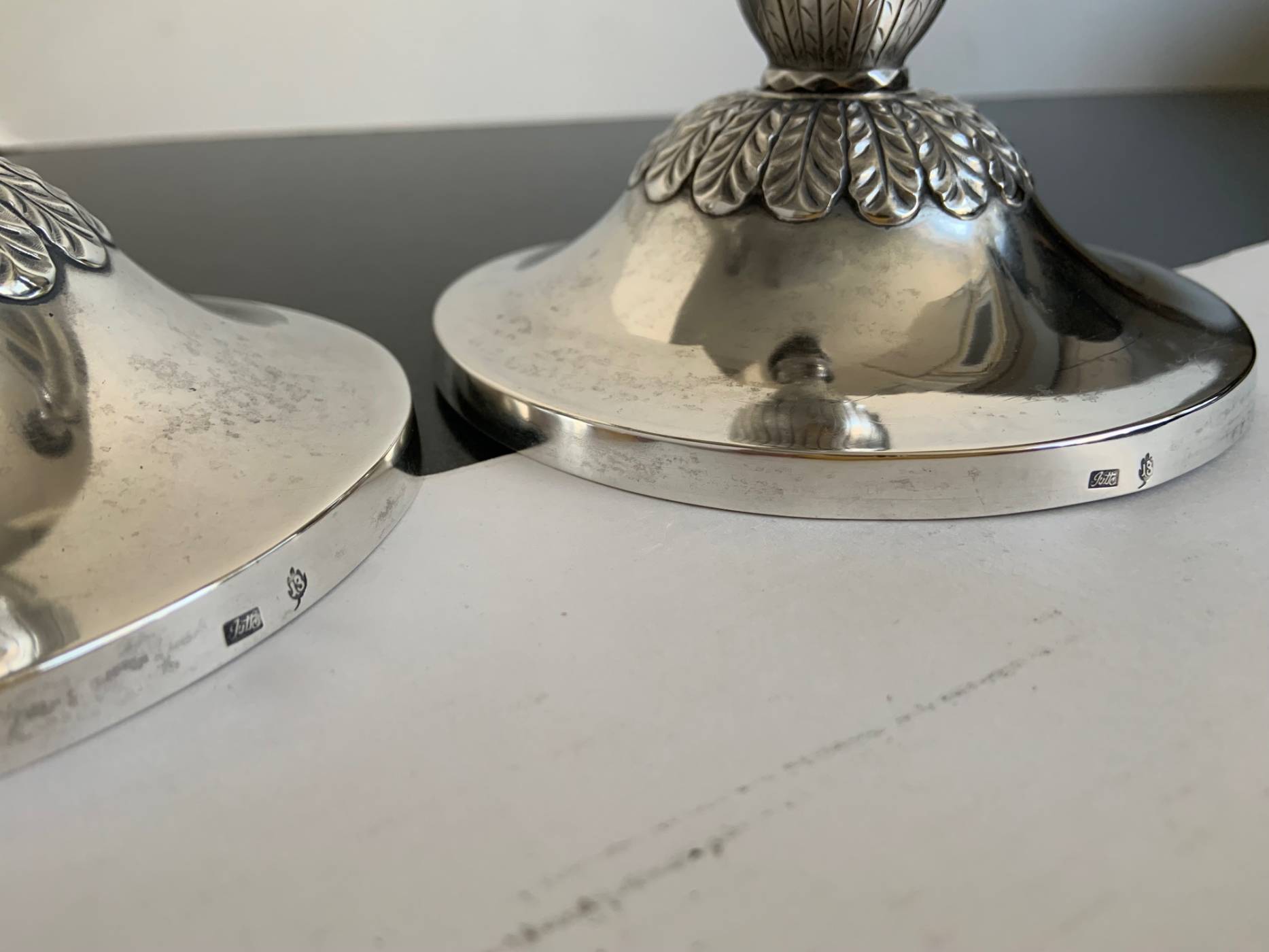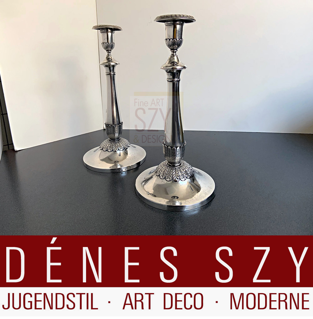 Es handelt sich hierbei um ein paar Empire-Leuchter nach französischem Geschmack. Besonders ist es festzuhalten, dass der Auftraggeber sich 13 Lötiges Silber