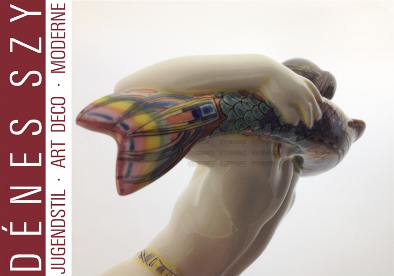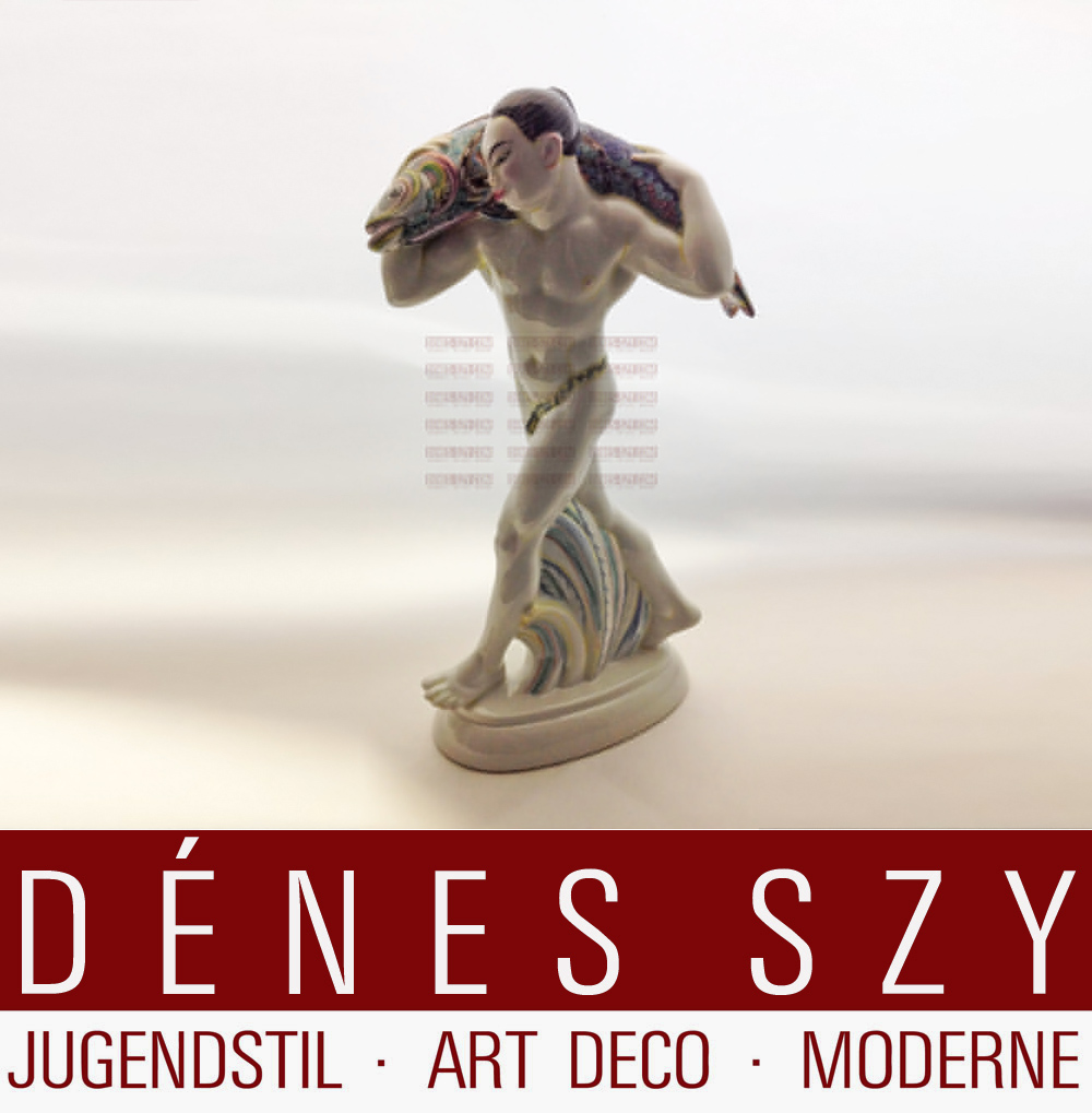 figura in porcellana di un giapponese con un pesce disegnato da Adolf Amberg 1910 per il corteo nuziale, manifattura reale di Berlino 1910 circa epoca liberty, con decorazione Art Deco