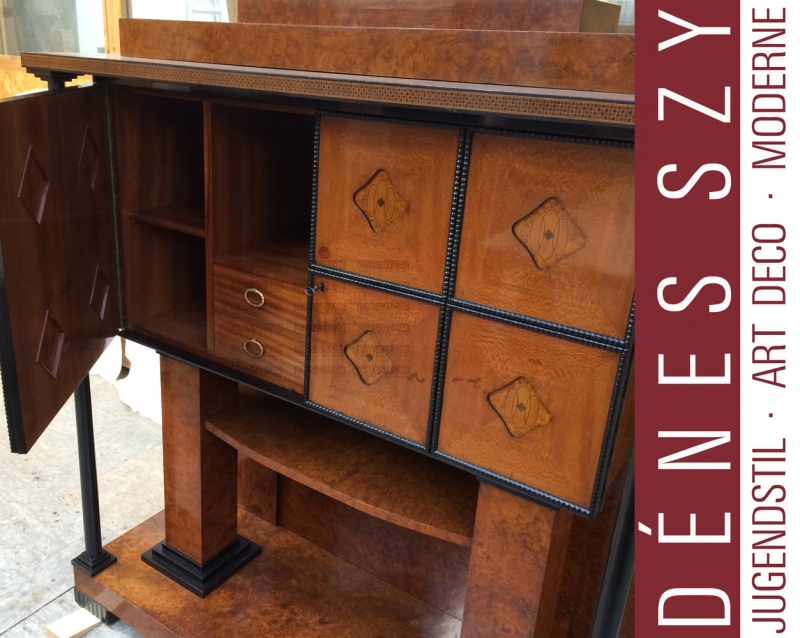 Platanenholz undf Perlahorn furniert, Intarsienarbeiten aus Perlmutt und verschiedenen Hölzern
