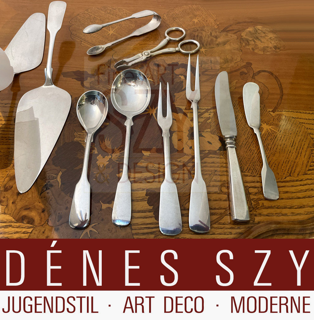 plus diverse Vorleger: 1x Vorlegelöffel 23 cm, 1x Vorlegelöffel 22,3 cm, 1x Saucenkelle 21,2 cm, 1x Saucenkelle 16,2 cm, 1x Tortenheber 23,4 cm, 1x Tortenheber 23,5 cm (Robbe & Berking), 1x Aufschnittgabel 18,9 cm, 1x Aufschnittgabel 14,9 cm, 1x Buttermesser 12,5 cm, 1x Obstmesser 16,5 cm, 1x Sahnelöffel 15,4 cm (Robbe & Berking), 1x Zuckerlöffel 13,1 cm, 1x Zuckerzange 10,8 cm. (Dazugegeben: 1x Zuckerbrechzange versilbert)