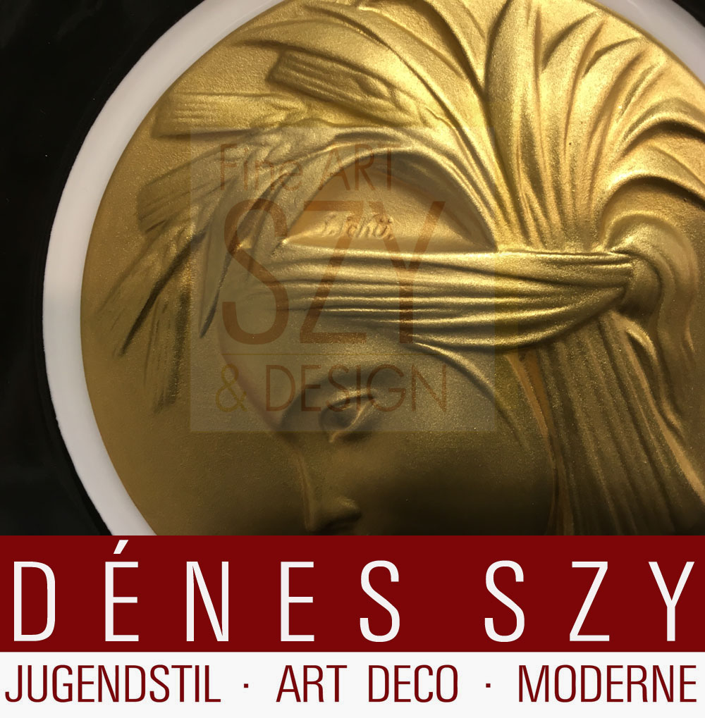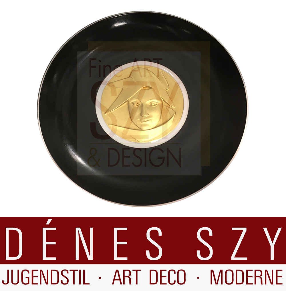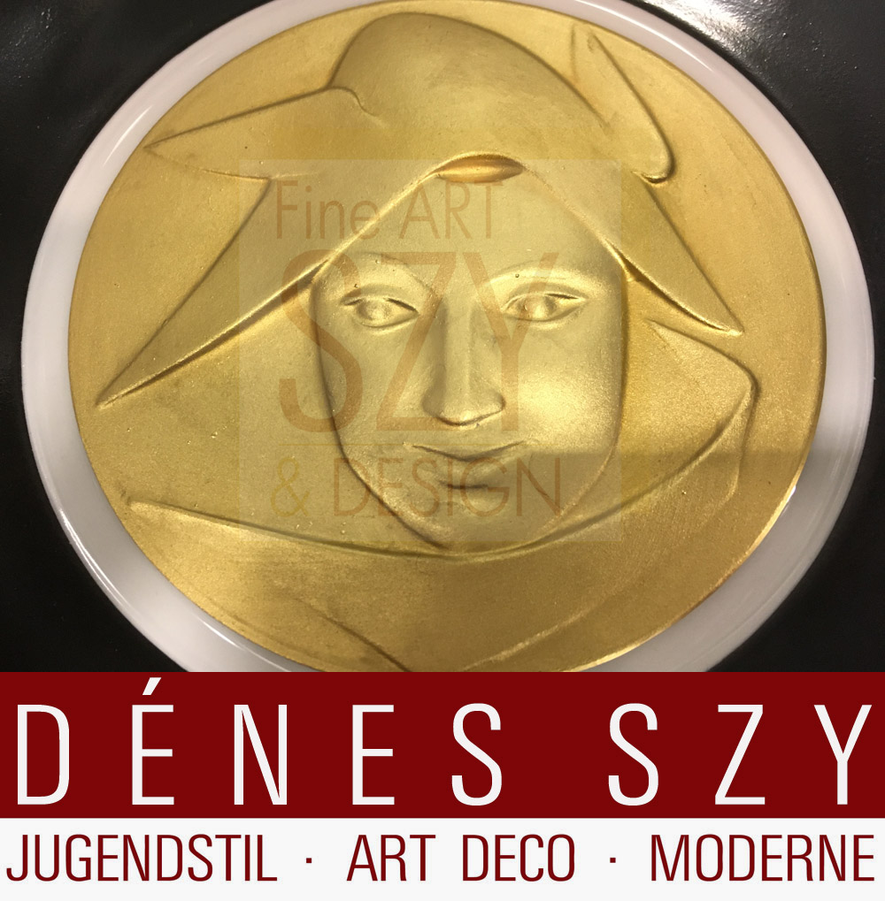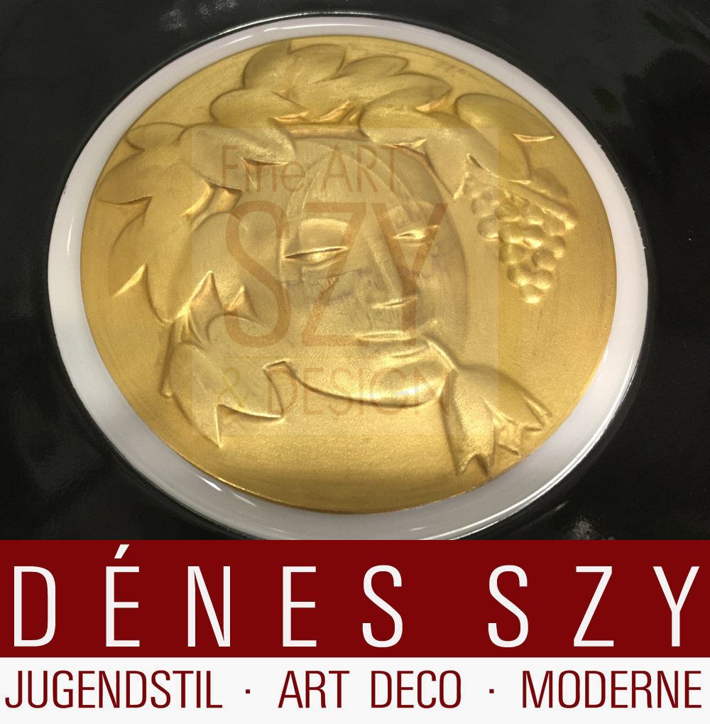 Sehr guter Zustand, minimale Gebrauchsspuren, zwei Medaillons mit Signatur S. Schü (Maske mit Ähren und Delphin)