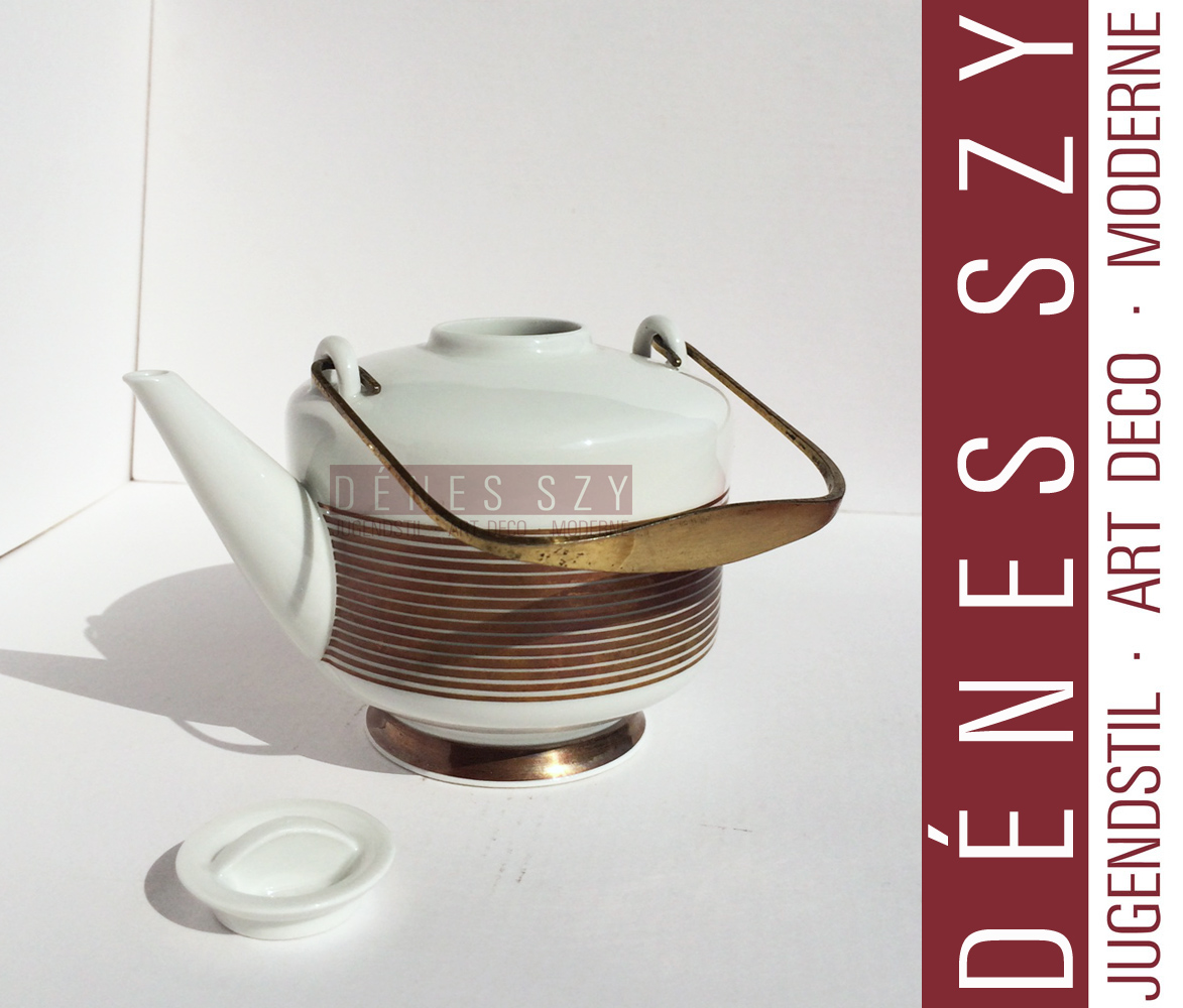 Burg Giebichenstein Halle, Porzellan Extraktkaennchen aus dem Service Hallesche Form Goldrillen-Dekor mit Buegelgriff aus vergoldetem Silber (900 gestempelt)