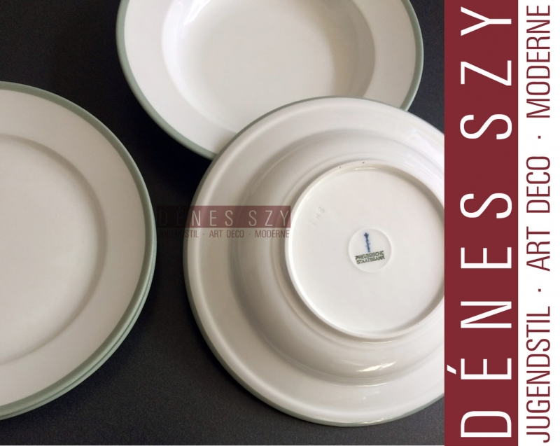 KPM Berlin Porzellan Essteller Speiseteller mit Seladonrand Festrand aus dem Service Neuberlin, Design Trude Petri 1931, PREUSSISCHE STAATSBANK.