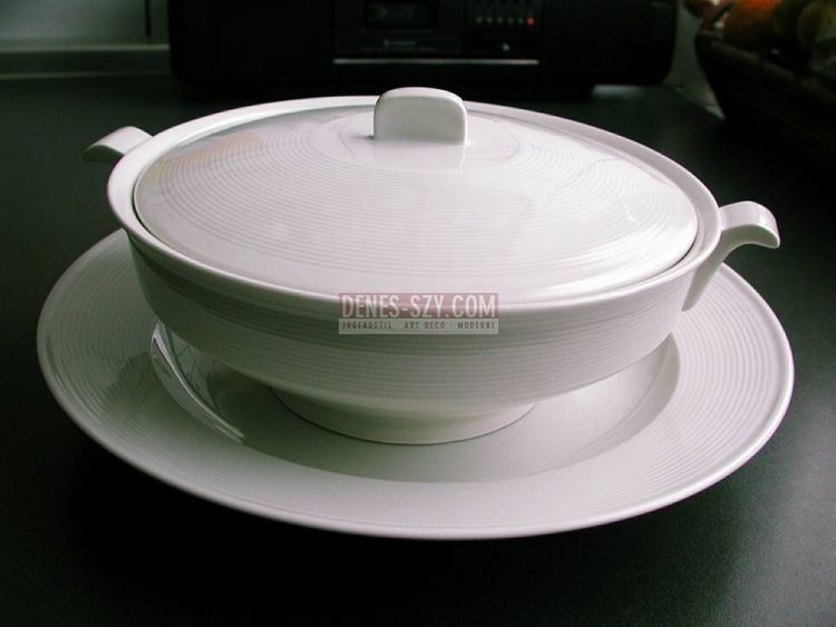 KPM Royal Berlin china Design Friedlaender Halle pattern tureen, Mid Century KPM Royal Berlin china tureen by FRIEDLAENDER, Halle pattern, soup tureen with cover Very elegant, simple Bauhaus time design German, Mid Century Modern KPM Royal Berlin China, Designed by Marguerite Friedlaender 1930/31 Burg Giebichenstein / Halle pattern Executed: StPM Berlin, Porcelain with pressed grooves Decor in white 1936 Height 12,6 cm, Width with handles 29,5 cm Mid Century Modern KPM Royal Berlin porcelain Design Marguerite Friedlaender 1930 Halle pattern tureen Burg Giebichenstein Germany. Literature: Broehan-Museum, Berliner Porzellan vom Jugendstil zum Funktionalismus 1889-1939, Seite 198 Excellent condition, 1st Choise