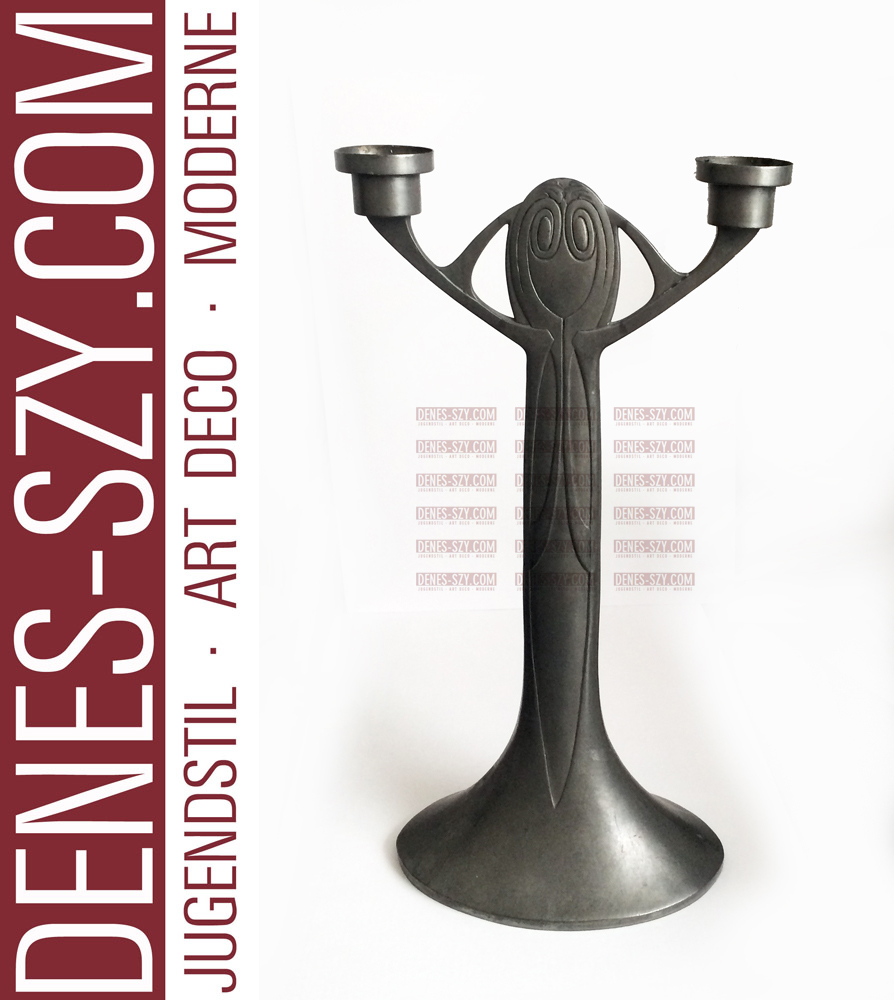 La Colonia degli Artisti di Darmstadt J.M. OLBRICH Art Nouveau Candelabra 1902 candelabra stannica con due bracci epoca liberty disegno: Joseph Maria Olbrich ~1902, Colonia degli artisti di Darmstadt; Germania fabbricazione: Eduard Hueck, Lüdenscheid ca. 1905, stagno altezza 36,2 cm ,base 17,3 cm x 11,4 cm — 1 Inch (Zoll) = 2,54 Zentimeter —