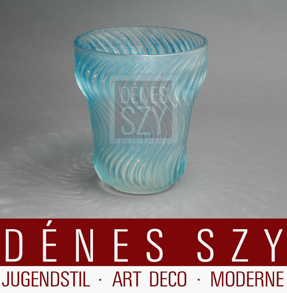 Lalique France Vase Actinia 1934 RENE LALIQUE, Vase, Blumenvase Glas-Vase « Actinia » von 1934 Französisches Art Deco Glas Ausführung: René Lalique 1860-1945, Frankreich Maße: Höhe 22 cm —  1 Inch (Zoll) = 2,54 Zentimeter – Antique 20th. Century French frosted und stained glass vase ca.1934 Blau irisierend, formgeblasen und gepudert / blue patinated – deep sky blue Signiert unter dem Stand R. Lalique Siehe bitte gleiches Modell andere Farbe in der Sammlung: Dallas Museum of Art, Actinia Zustand : sehr gut Literatur: MARCILHAC S. 462: