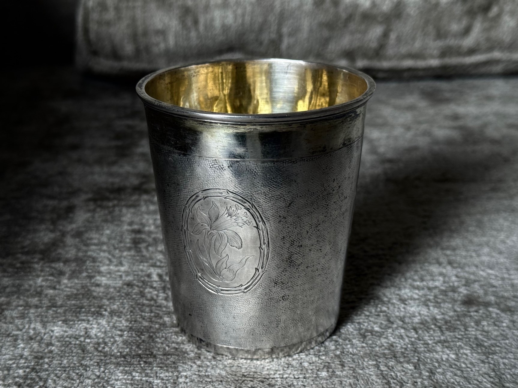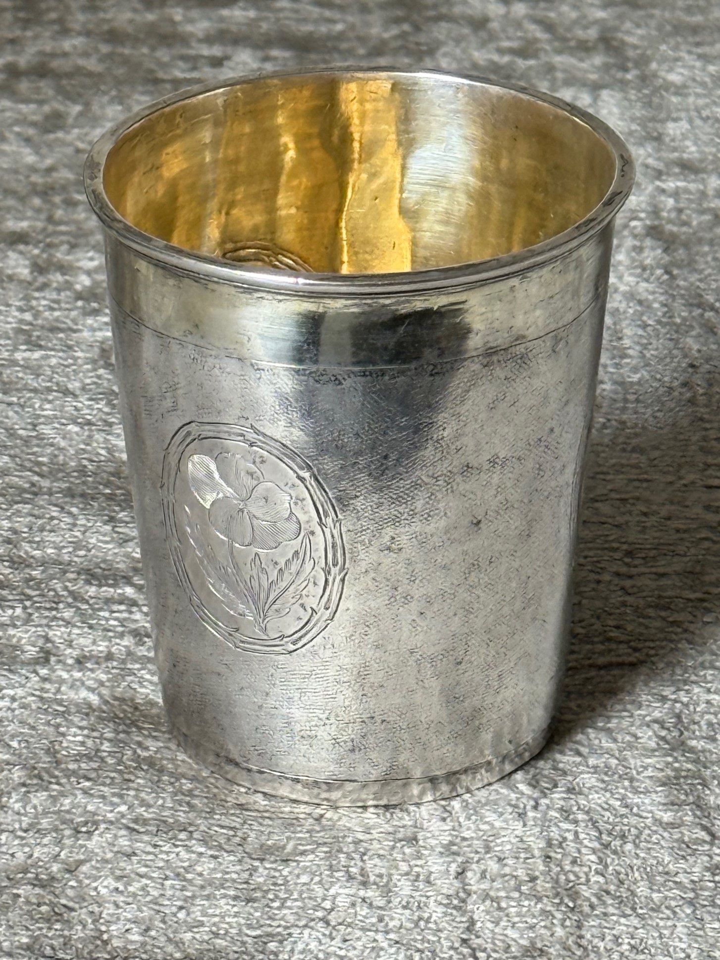 Qualitätvoller barocker Schlangenhaut Silberbecher aus Leipzig in gestreckter leicht konischer Form. Typische Schlangenhautstruktur mit lebendiger Oberfläche und fein differenzierter Lichtwirkung. Drei ovale Medaillons mit Blütengravur in norddeutscher Manier gliedern die Wandung. Innen vollständig feuervergoldet ebenso der Lippenrand zart vergoldet.