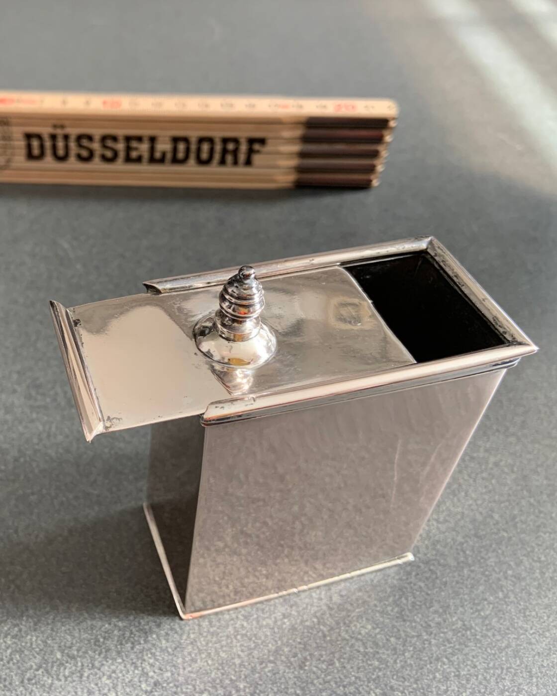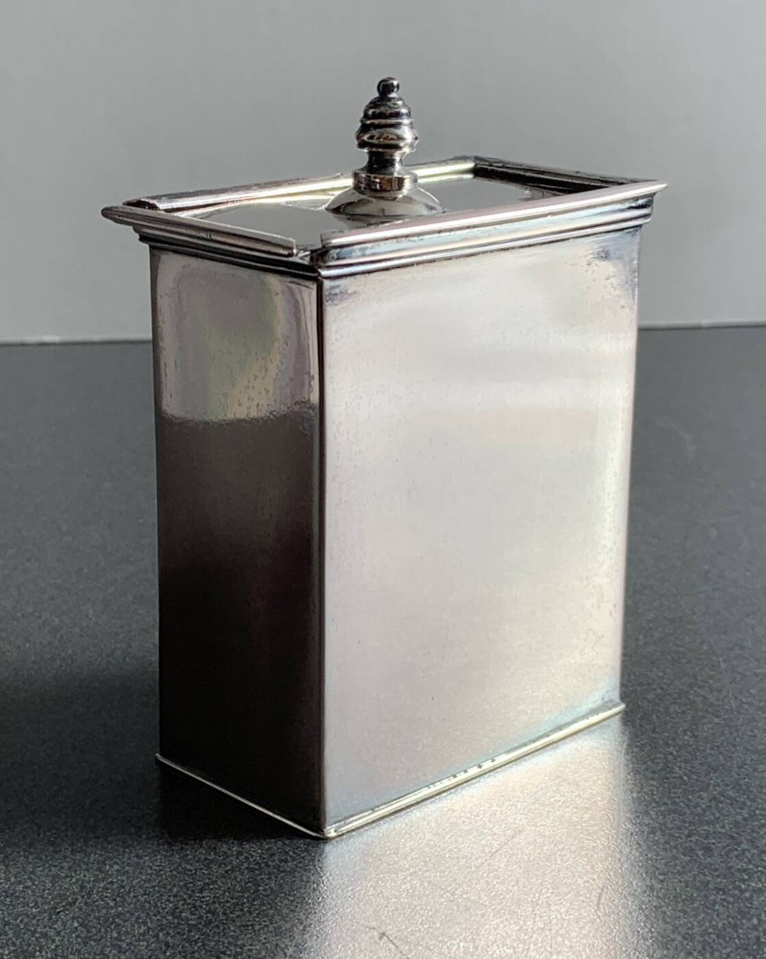 Der Korpus hat eine rechteckige Form und der verschiebbare Deckel (zum Nachfüllen gedacht) ist flach, mit nur einer Handhabe. Möglicherweise ursprünglich Teil einer Reise Garnitur.