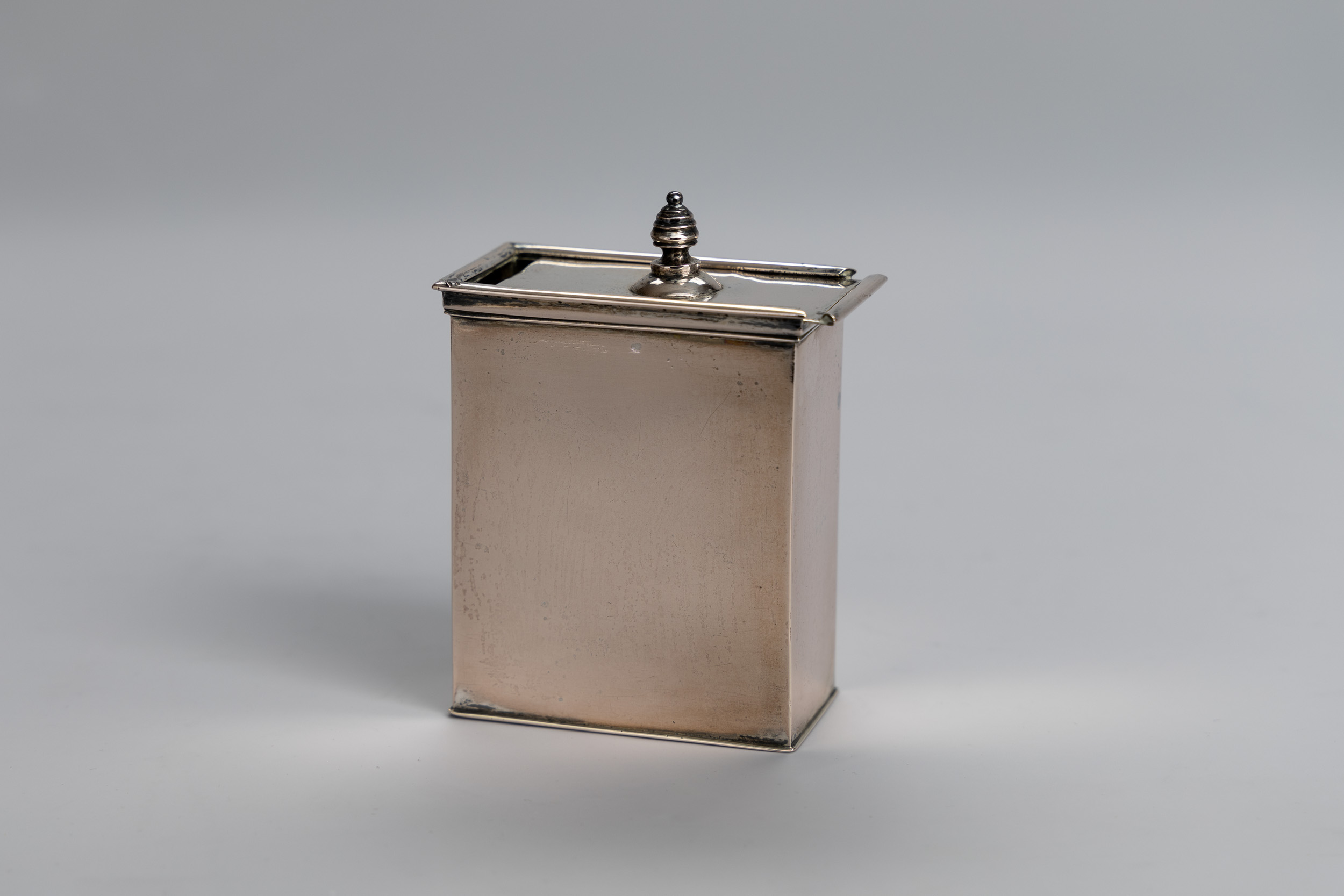 Der Korpus hat eine rechteckige Form und der verschiebbare Deckel (zum Nachfüllen gedacht) ist flach, mit nur einer Handhabe. Möglicherweise ursprünglich Teil einer Reise Garnitur.
