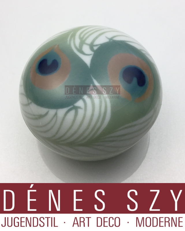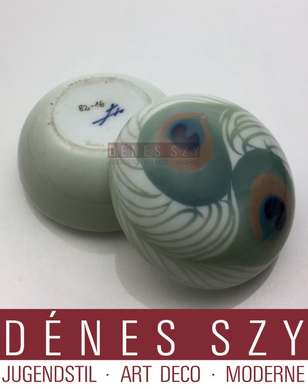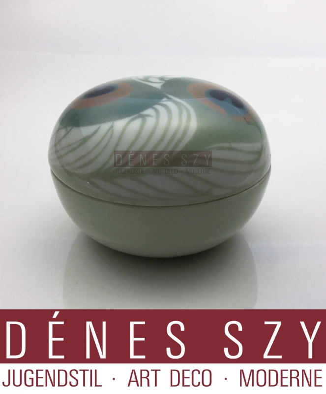 German Art Nouveau porcelain covered box, bonboniere by Rudolf Hentschel attr., peacock feather decoration, Design Ca.1900.
