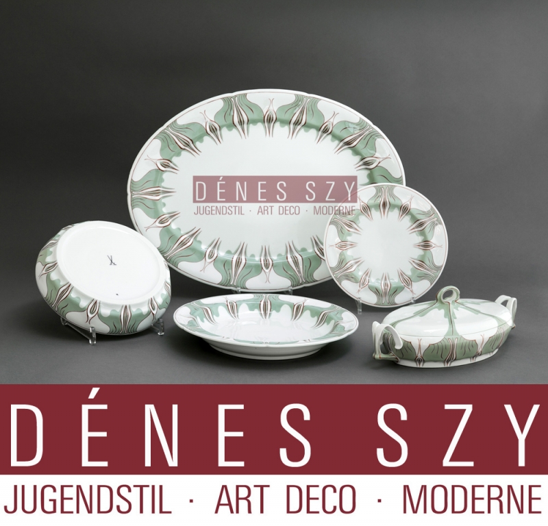Meissen, Hentschel, Art Nouveau porcelain, dejeuner, serving tray, Crocus pattern. Meissen tray, crocus pattern, KONRAD HENTSCHEL ca. 1900 This is the first variation from the crocus pattern in celadon green and rusty red. Meissen Art Nouveau china Design: Konrad Hentschel um 1897 Execution: Royal porcelain manufactory Meissen 1905-10 dimensions: 36 x 42 cm marked with crossed swords, first choice very good condition Konrad Hentschel [Cologne 1872 – 1907 in Meißen], German porcelain modeller and designer. 1889 visit to the drawing school in Meissen, then apprenticeship as a Bossierer and subsequent study at the Art Academy Munich. 1894-96 worked as a Bossierer for the porcelain manufactory Meissen. In 1896, the manufactory announced a competition for the development of a Déjeuner, which should be inexpensive and modern at the same time, The young Konrad Hentschel designed his “Crocus Dejeuner” and created the first Art Nouveau tableware that was to be admired at the World Exhibition in Paris in 1900 and immediately found many lovers. (Hentschel, Konrad) Royal KPM MEISSEN 1900, German Art Nouveau porcelain, Design Konrad Hentschel, 1.st version, ‘Krokus’ Crocus pattern, Dejenuer, serving tray, Germany 1902. We are happy to take care of your wishes, please click on the upper right corner DO YOU HAVE QUESTIONS? or at the top right on CONTACT. Or visit our antique shop during the opening hours. Find more objects on our product page!